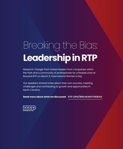 Breaking the Bias: Leadership in RTP Research Triangle Park hosted leaders from companies within the Park and a community of professionals for a fireside chat at Boxyard RTP on March 8, International Women’s Day. Our speakers shared notes about their own success, meeting challenges and contributing to growth and opportunities in North Carolina. Read more about what we discussed RTP.ORG/BREAKINGTHEBIAS