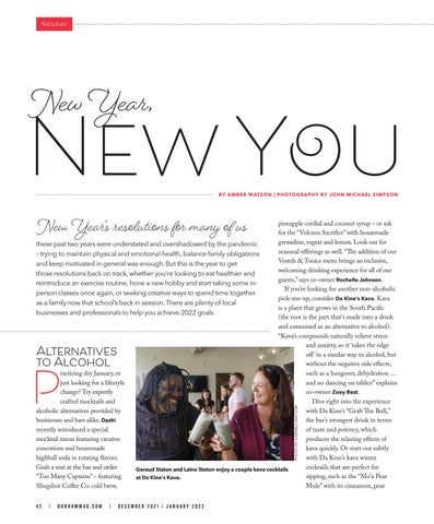 pineapple cordial and coconut syrup – or ask for the “Volcano Sacrifice” with housemade grenadine, orgeat and lemon. Look out for these past two years were understated and overshadowed by the pandemic seasonal offerings as well. “The addition of our – trying to maintain physical and emotional health, balance family obligations Vestels & Tonics menu brings an inclusive, and keep motivated in general was enough. But this is the year to get welcoming drinking experience for all of our those resolutions back on track, whether you’re looking to eat healthier and guests,” says co-owner Rochelle Johnson. reintroduce an exercise routine, hone a new hobby and start taking some inIf you’re looking for another non-alcoholic person classes once again, or seeking creative ways to spend time together pick-me-up, consider Da Kine’s Kava. Kava as a family now that school’s back in session. There are plenty of local is a plant that grows in the South Pacific businesses and professionals to help you achieve 2022 goals. (the root is the part that’s made into a drink and consumed as an alternative to alcohol). “Kava’s compounds naturally relieve stress and anxiety, so it ‘takes the edge off ’ in a similar way to alcohol, but without the negative side effects, such as a hangover, dehydration … racticing dry January, or and no dancing on tables!” explains just looking for a lifestyle co-owner Zoey Best. change? Try expertly Dive right into the experience crafted mocktails and with Da Kine’s “Grab The Bull,” alcoholic alternatives provided by the bar’s strongest drink in terms businesses and bars alike. Dashi of taste and potency, which recently introduced a special produces the relaxing effects of mocktail menu featuring creative kava quickly. Or start out subtly concotions and housemade with Da Kine’s kava winter highball soda in rotating flavors. cocktails that are perfect for Grab a seat at the bar and order Geraud Staton and Laine Staton enjoy a couple kava cocktails sipping, such as the “Mo’a Pear “Too Many Captains” – featuring at Da Kine's Kava. Mule” with its cinnamon, pear Slingshot Coffee Co. cold brew,