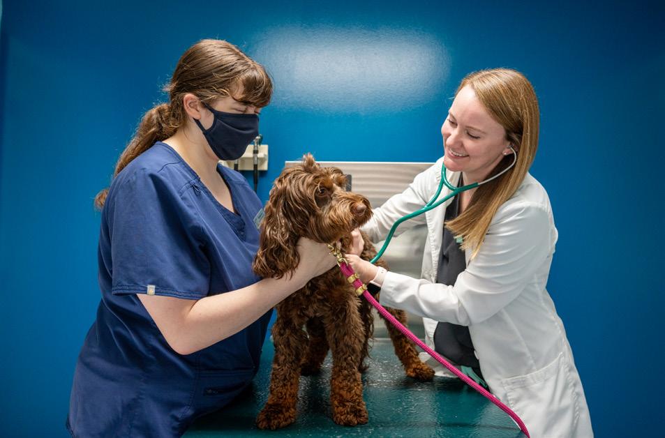 ABOVE Rebecca Fasanella and Dr. Katie Hanrahan give dog, Duchess, an exam at Park Vet. “It’s actually a veterinary hospital trend that there are fewer clients out there right now coming to the practices,” said Park Vet Manager Kristy White. “We believe it’s more of an economical issue.”
