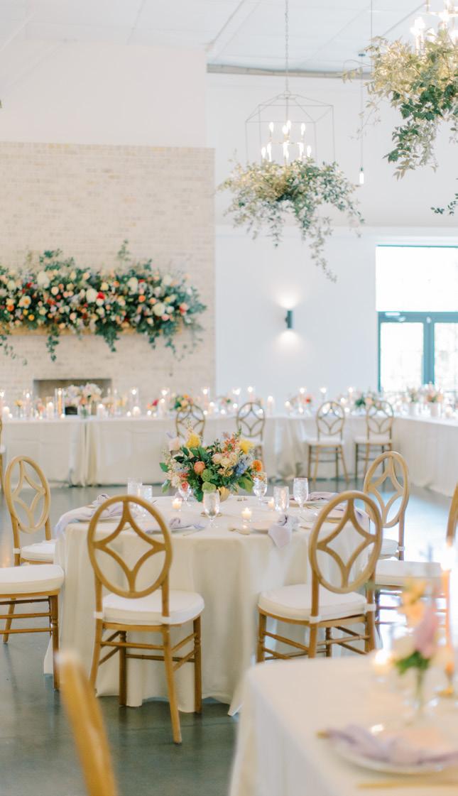 “The large windows flood the space with natural light, making Melrose a dreamy indoor ceremony spot, especially during the off-season when outdoor locations would be extremely hot or cold,” says photographer Danielle Volk. Lounge chairs, an unconventional but luxurious choice for ceremony seating, offer comfort for guests and can be repurposed for later in the evening. The third-floor space