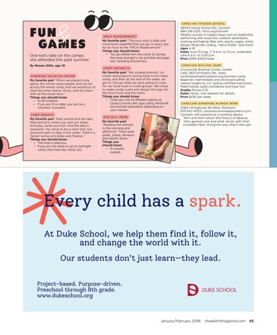 4809 Friends School Rd., Durham 984-316-0123; cfsnc.org/summer Weekly courses in subject areas such as leadership, performing and visual arts, outdoor adventures, cooking and baking, fiber arts, sports, Legos, comic design, Minecraft, coding, “Harry Potter” and more! Ages 4-18 Dates June 15-Aug. 7; 9 a.m. to 3 p.m.; extended care 8 a.m. to 5:45 p.m. Price $395-$430/week Crosswinds Boating Center, Jordan Lake, 565 Farrington Rd., Apex carolinasailingfoundation.org/summer-camp Beginner, intermediate and advanced sailing classes taught by U.S. Sailing certified-instructors. Make friends, build confidence and have fun! Grades Rising 4-10 Dates Varies, visit website for details. Price $435 per week CA R OLINA SUNSHINE ALPACA FA R M