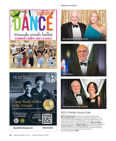 SECU Family House Gala SECU Family House held its annual gala Sept. 26 at The Carolina Club, bringing supporters together for an inspiring evening celebrating community generosity. The event raised more than $350,000 – enough to provide 2,600-plus nights of care for patients at UNC Hospitals. Former board chair Johnny Morris and longtime supporters Charles Harrison and Patsy Harrison were honored with induction into the SECU Hall of Fame for their enduring commitment to the organization’s mission. By Libby Wakefield CHM 82