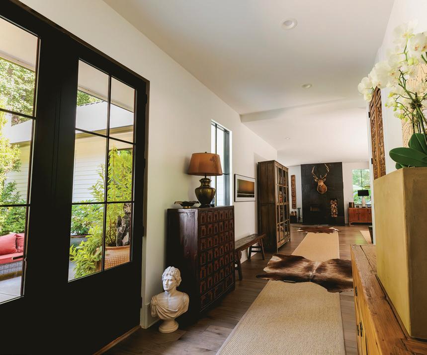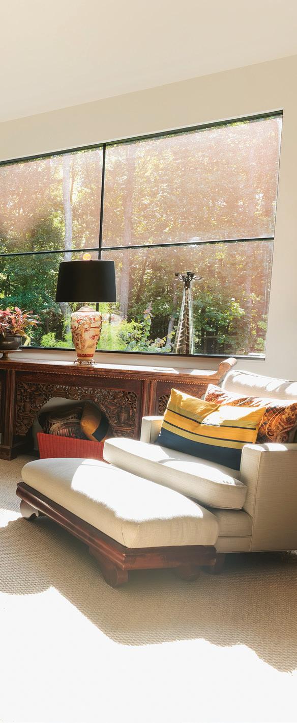 Natural light plays a starring role. The ceilings were raised to 10 feet to accommodate square windows that frame the woods. The couple intentionally does not have many window coverings to let the outdoors in. “I wanted a western evening exposure,” Robin says. “Now, when the leaves are down and the sun is setting, it’s really gorgeous, a Maxfield Parrish kind of sky.”