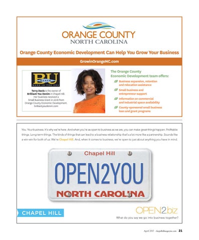 Orange County Economic Development Can Help You Grow Your Business GrowinOrangeNC.com The Orange County Economic Development team offers: Business expansion, retention and relocation assistance Terry Davis is the owner of Brilliant You Denim in Chapel Hill. Her business received a Small Business Grant in 2016 from Orange County Economic Development. brilliantyoudenim.com