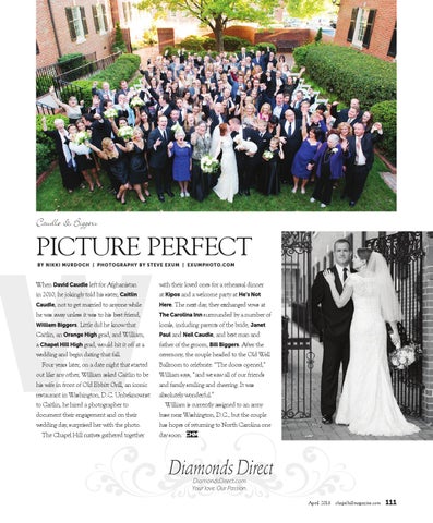 with their loved ones for a rehearsal dinner at Kipos and a welcome party at He’s Not Here. The next day, they exchanged vows at The Carolina Inn surrounded by a number of locals, including parents of the bride, Janet Paul and Neil Caudle, and best man and father of the groom, Bill Biggers. After the ceremony, the couple headed to the Old Well Ballroom to celebrate. “The doors opened,” William says, “and we saw all of our friends and family smiling and cheering. It was absolutely wonderful.” William is currently assigned to an army base near Washington, D.C., but the couple has hopes of returning to North Carolina one day soon. CHM