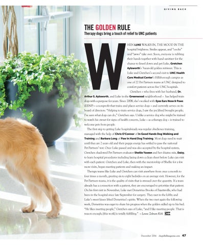 Therapy dogs bring a touch of relief to UNC patients HEN LUKE WALKS IN, THE MOOD IN THE hospital brightens. Smiles appear, and “ooohs” and “awws” take over. Soon, everyone is rubbing their hands together with hand sanitizer for the chance to kneel down and pet Luke, Gretchen Aylsworth’s 3-year-old golden retriever. This is Luke and Gretchen’s second visit to UNC Health Care Medical Center’s Hillsborough campus as one of 22 Pet Partners teams at UNC designed to comfort patients across five UNC hospitals. Gretchen – who lives with her husband, Dr. Arthur S. Aylsworth, and Luke in the Greenwood neighborhood – has helped train dogs with a purpose for years. Since 2008, she’s worked with Eyes Ears Nose & Paws (EENP) – a nonprofit that trains and places service dogs – and currently serves on its board of directors. “Helping to train service dogs, I saw the joy [they] brought people; I’ve seen what dogs can do,” Gretchen says. Unlike a service dog who might be trained to watch his owner for signs of health concern, Luke – as a therapy dog – is trained to welcome pets from people. The first step to getting Luke hospital-ready was regular obedience training, managed with the help of Chris O’Connor of In Good Hands Dog Walking and Training and Barbara Long of Paw In Hand Dog Training. Most dogs need to wait until they are 2 years old and their puppy energy has settled to pass the national Pet Partners’ test. Once Luke passed and was also accepted by the hospital system, Gretchen shadowed Pet Partners evaluator Shellie Yaseen and her shiatsu mix, Daisy, to learn hospital procedures including laying down a clean sheet before Luke can visit with each patient. Gretchen and Luke, then with the mentorship of Shellie for a few more visits, began meeting patients and making an impact. Therapy teams like Luke and Gretchen can visit anywhere from once a month to four times a month, greeting six to eight bedsides on an average visit. However, for the Pet Partners teams, it is the quality of visits that is stressed over the quantity. If a team already has a connection with a patient, they are encouraged to prioritize that patient. On his first visit in November, Luke met Demetrius Brooks of Fayetteville, who had been in the hospital since late September for surgery. They met in the lobby and Luke’s sweet kisses lifted Demetrius’s spirits. When the two met again the following week, Demetrius was eager to share his progress when the golden sidled up to his bed. “He likes meeting people,” Gretchen says of Luke, “and I like meeting people. That is reason enough; [this work] is totally fulfilling.” – Laura Zolman Kirk CHM