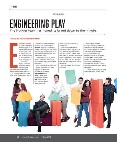 a warehouse on Nash Street to build, box and ship the Nugget, a colorful, “infinitely configurable play couch” whose mission, the founders say, is to “encourage imagination” and “embolden play.” The Nugget is more than a couch. It’s also a purpose, a successful startup, a model of efficiency. And it all began in the trash. When they first had their big idea in 2012, the Nugget co-founders David Baron and Ryan Cocca were undergraduates at UNC and they’d had enough of the cheap big-box