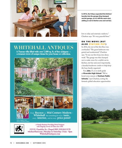 ON THE MOVE (BUT A L S O S TAY I N G P U T ) In 2016, the rest of the first floor was overhauled. “The guest bathroom was gutted and modernized,” Charlene says. “It was our first foray into demo work.” The garage was then bumped out to make room for a stylish eat-in kitchen, wet bar and, most importantly, a laundry/mudroom combo to help keep the busy family organized. Son Jake, 15, is in ninth grade at Riverside High School. “We’ve loved every minute of Durham Public Schools,” says Charlene, noting the fantastic global education opportunities