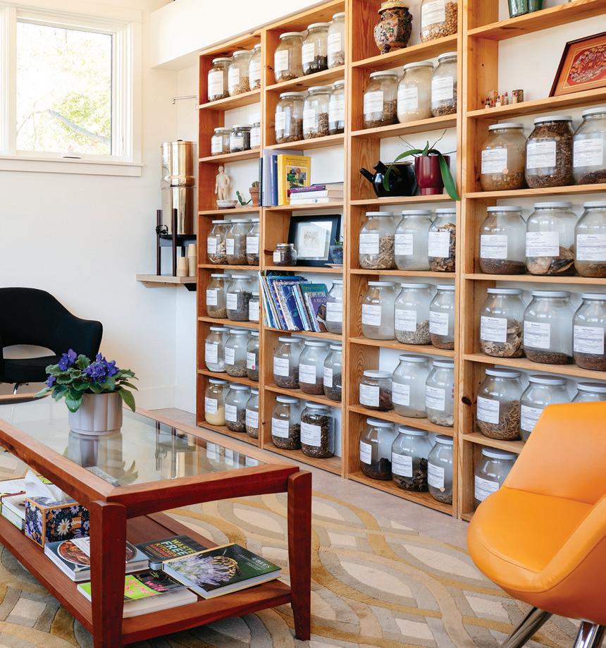 RIGHT The waiting area's open shelves, which were built by Dagmar and moved from the Broad Street clinic, display herbs, teas and books central to traditional Asian medicine.