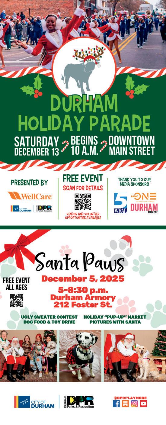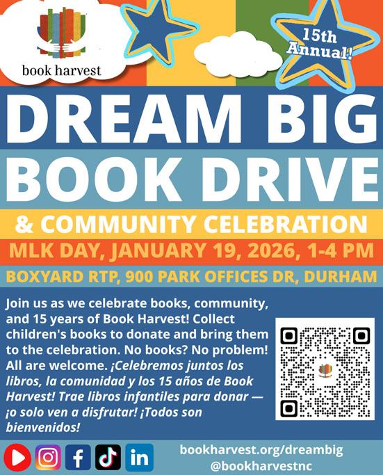 Welcome Baby’s 13th annual winter coat drive is collecting new and gently used coats, hats and scarves for kids from newborn to age 8 through Jan. 9, 2026. Items can be dropped off at the Welcome Baby office; the Durham County Main, East Regional, North Regional, South Regional and Southwest Regional library branches; or local businesses like The Little Gym, Der Nachbar Bottleshop & Taps and Once Upon a Child (if you purchase a coat here for the coat drive, you will receive a $5 coupon to use on your next purchase). Coats should be freshly washed and ready to keep a child warm through the cold months.