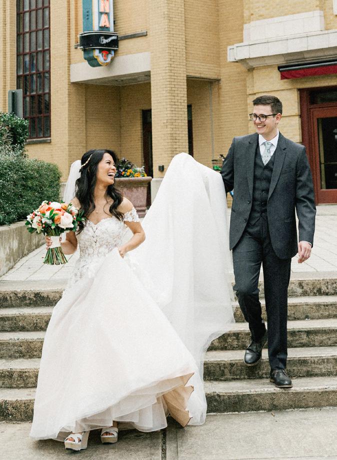 The Big Day The pair welcomed their guests – who stayed at the Durham Marriott City Center and Unscripted Durham – at Motorco’s Parts & Labor with light bites and drinks. A ceremony at the Carolina Theatre reflected the couple’s love of performing, complete with custom playbills by Carrboro’s Peel Gallery + Photo Lab and use of the theater’s dressing room for hair and makeup to tie the theme together. Bride, groom and guests –including Durham residents, bridesman Cameron Bright and bridesmaid Genevieve Hammersley – paraded joyfully down Foster Street to The Rickhouse for the reception, where guests enjoyed family-style Southern fare and popsicles from LocoShop across the street for dessert. The evening ended with dancing, whimsy, and late-night games and snacks at Boxcar Bar + Arcade. Eva Walker of Emily Katherine Events helped plan the day, which came together with decor from American Party Rentals, flowers by Tre Bella and alterations by The Rheu Co