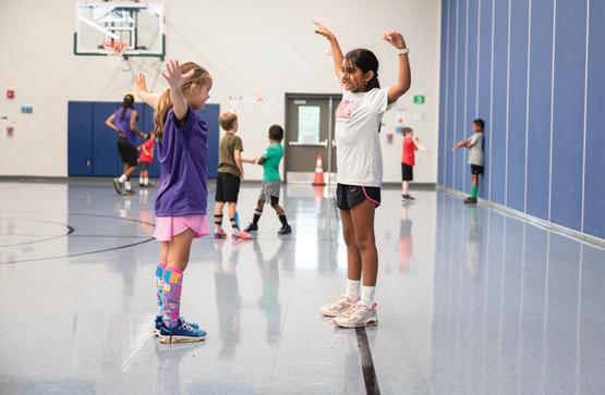 BELOW Rey Marusiak, 8, and Amelia Pagadala, 10, engage in team-building activities before heading outside to play.