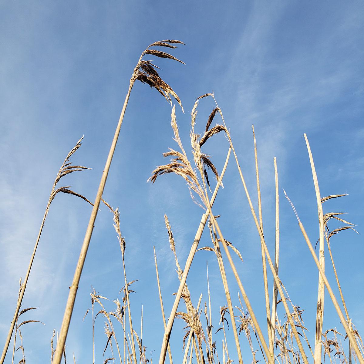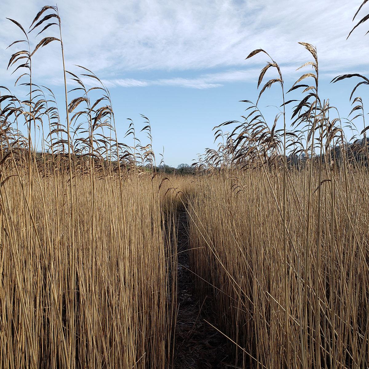 Phragmites, the common reed, dominates. Its rhizomes push boundaries. Fresh water enters from streams; saltwater flows with tides.