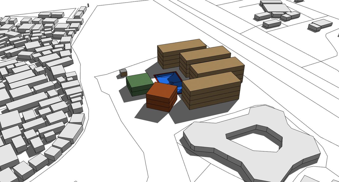 Gubahan massa tersebut berorientasi pada lapangan sebagai area komunal. Hal ini dikarenakan agar penghuni bisa tetap punya aktivitas bersama yang positif untuk kesehatan dan sosial mereka. Di sebelah kiri terdapat jalan yang memungkinkan penduduk sekitar beribadah di masjid, serta berkunjung ke area komersial.