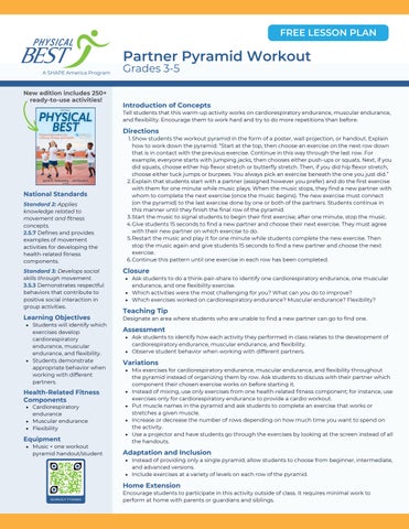 2 Explain that students start with a partner (assigned however you prefer) and do the first exercise with them for one minute while music plays When the music stops, they find a new partner with whom to complete the next exercise (once the music begins) The new exercise must connect (on the pyramid) to the last exercise done by one or both of the partners Students continue in this manner until they finish the final row of the pyramid