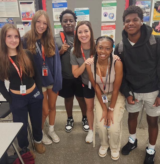 High school health educator Kara Young (fourth from left) has a morning check-in with students.