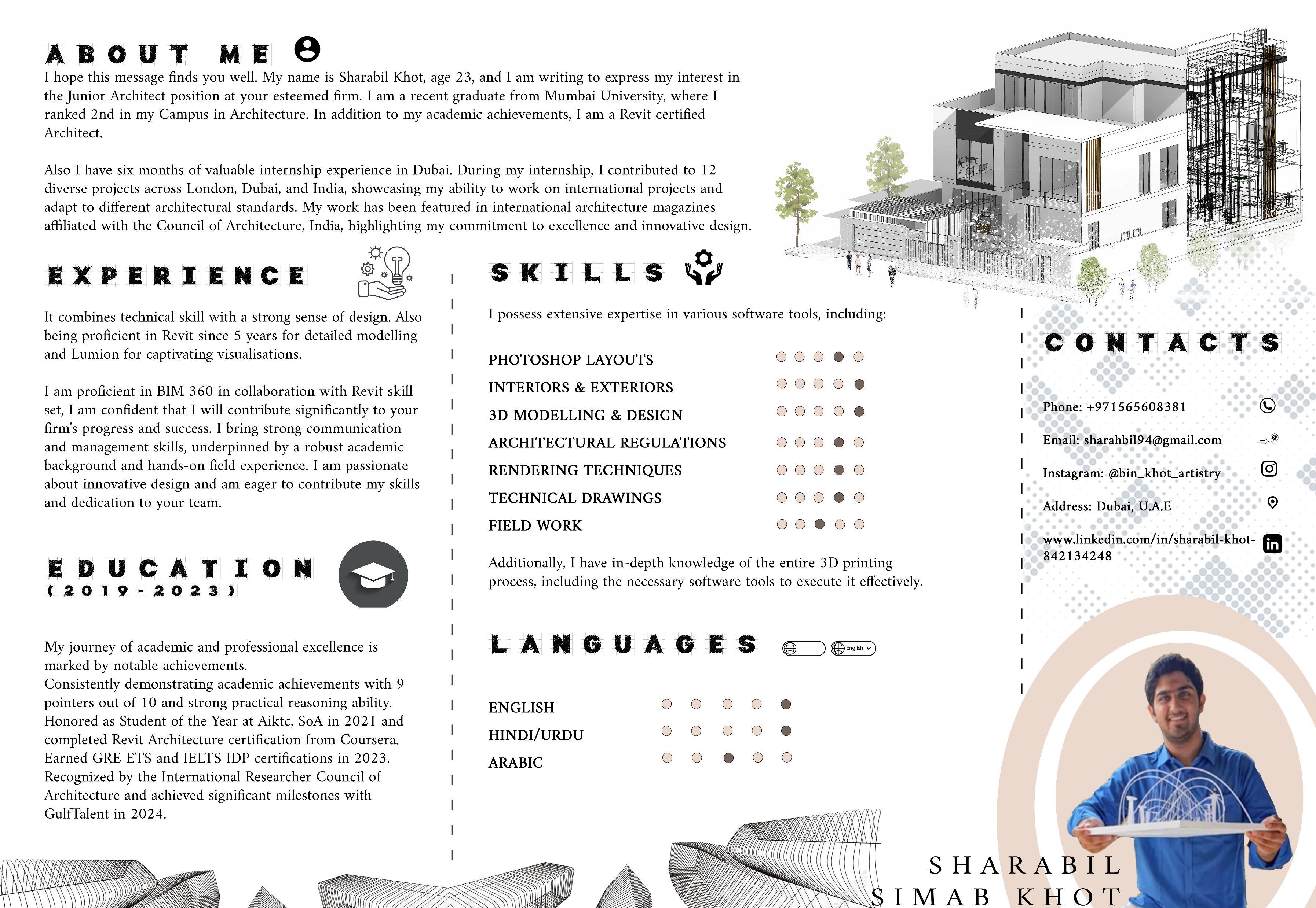 I hope this message finds you well My name is Sharabil Khot, age 23, and I am writing to express my interest as an Architect in position at your esteemed firm. I am graduated from Mumbai University, where I ranked 2nd in my Campus inArchitecture. In addition to my academic achievements, I am a Revit certifiedArchitect.