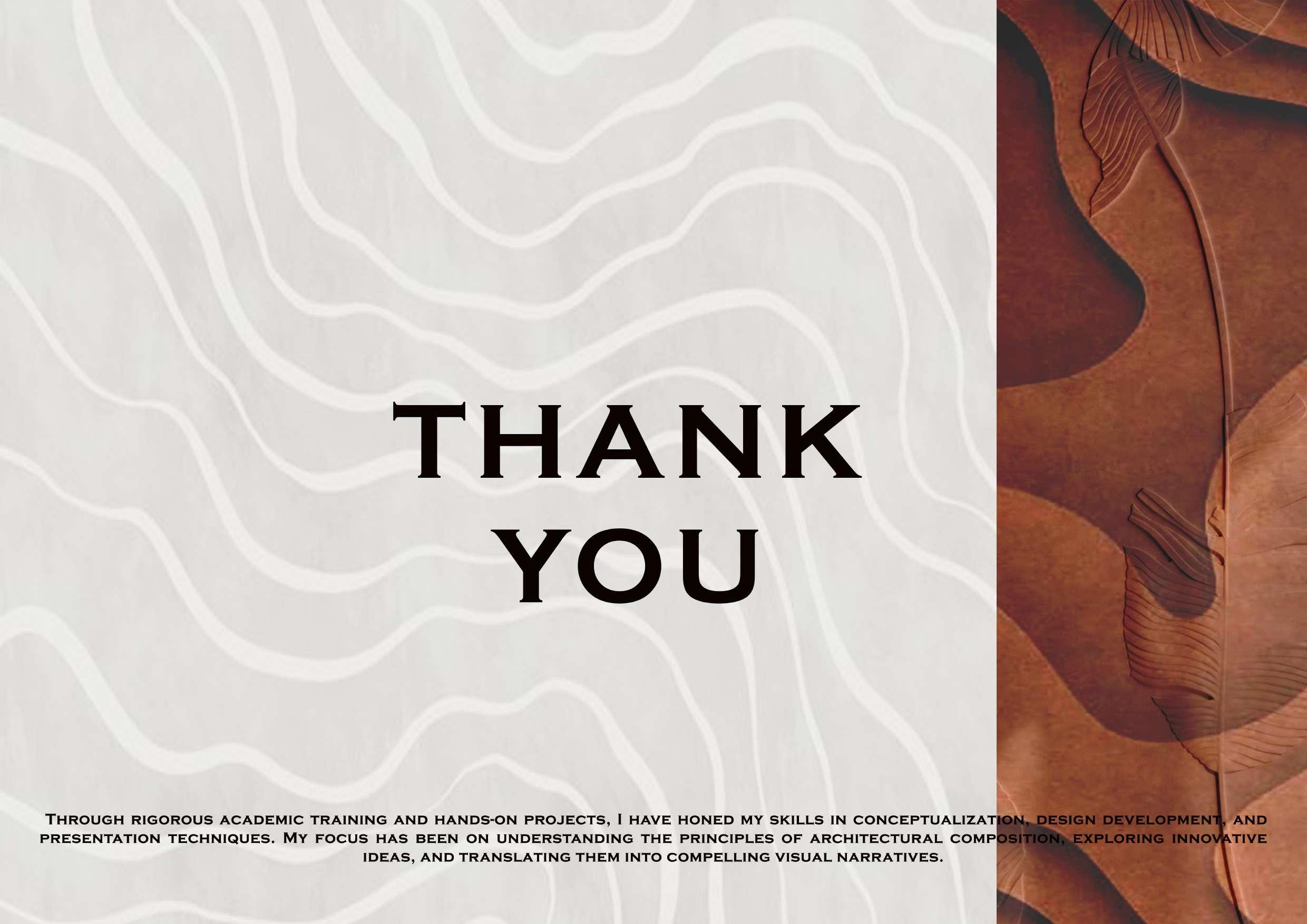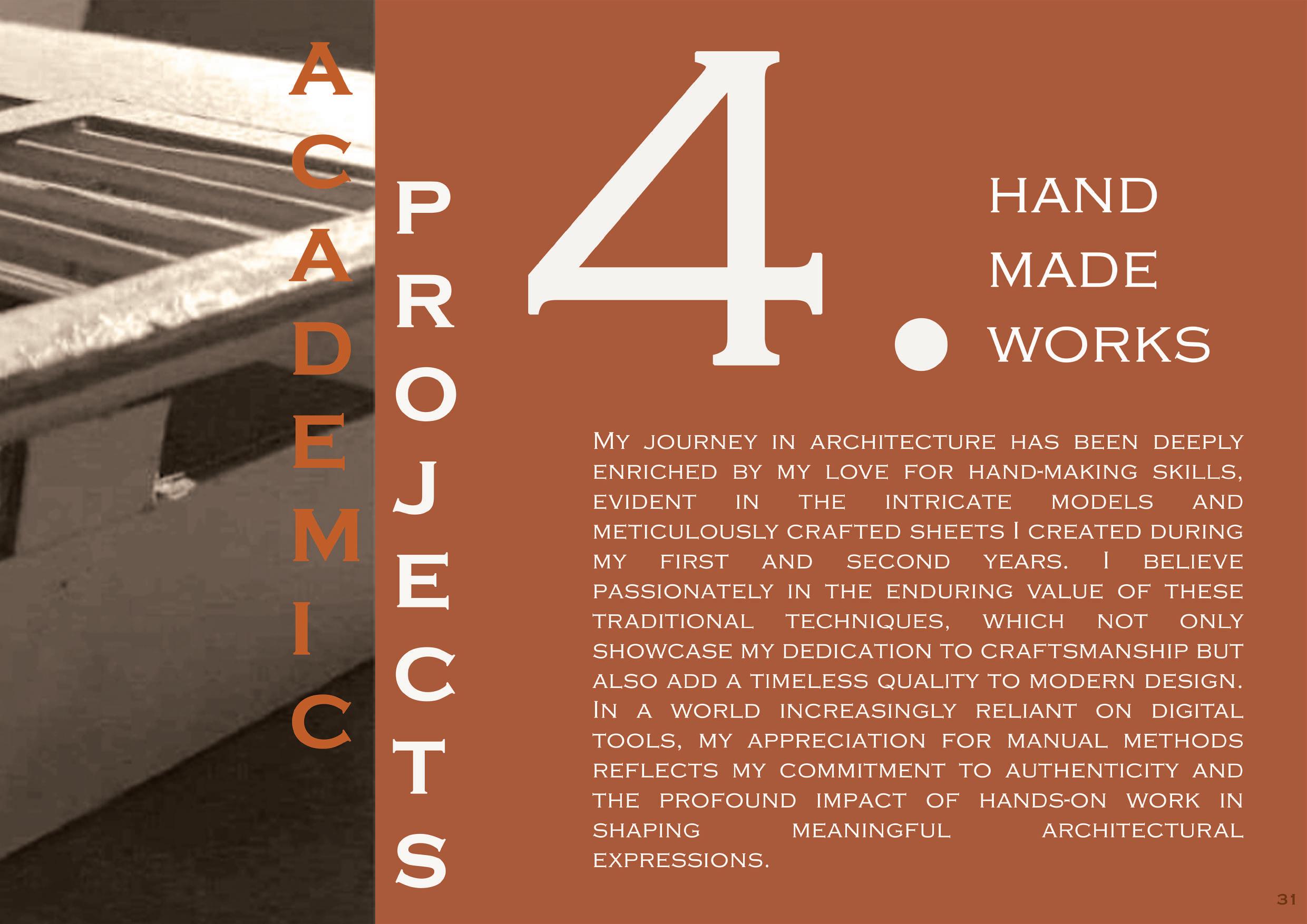 This portfolio showcases my journey and achievements throughout my fourth year in architecture school. From conceptual designs to practical applications, it highlights my creativity, problem-solving skills, and dedication to the craft. Each project represents a culmination of knowledge and experience gained, reflecting my passion for creating spaces that inspire and resonate with people. I invite you to explore my work and witness the evolution of my design sensibilities.
