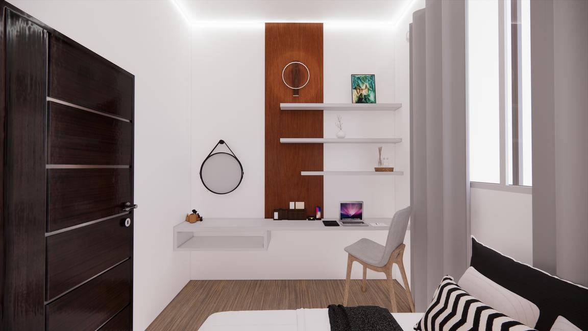this project assigned to create a study space measuring 3x3 m In the study room this time using the concept of minimalist & blending earth tone colors consisting of black, gray, terracotta, cream and white This study room also uses shelves / cabinets that can be used to save space so that the room feels more spacious Then also added some accessories displays & some paintings to add aesthetics