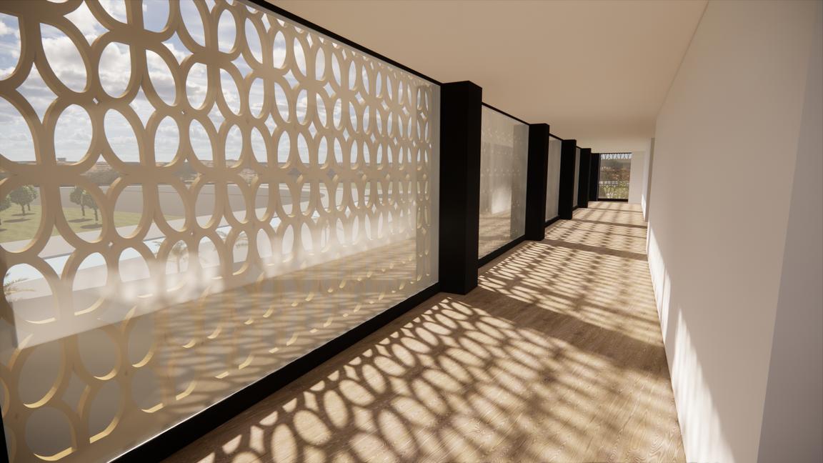 This part of the ornament has a shape or pattern derived from batik (Batik kawung). This batik pattern from Yogyakarta has the main meaning, which is a symbol of welfare and justice. This section serves as a sun-shading of the gallery building which is placed on the 3rd floor
