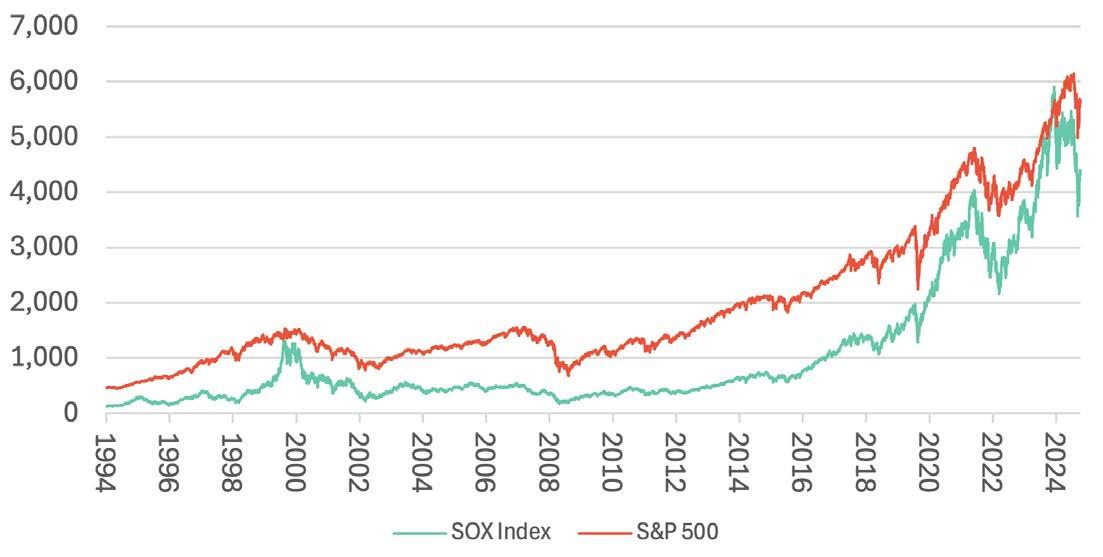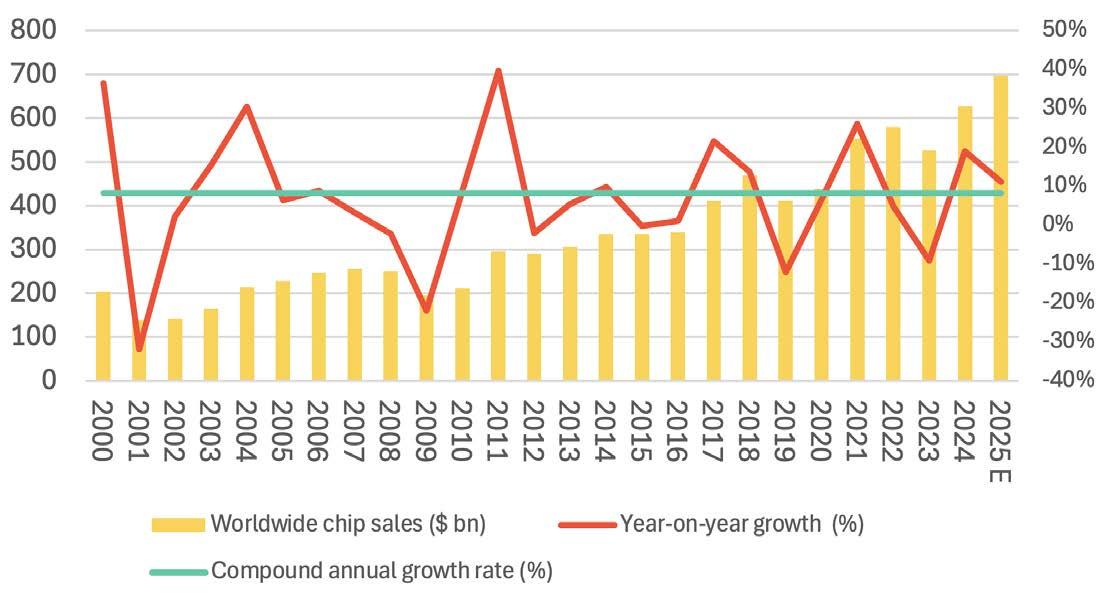 investment perspective for two reasons. First, by dint of their ubiquity, silicon chips offer a good insight to global economic activity. Global sales have risen by around 8% on a compound annual basis over the last forty-odd years, but with some big booms and busts along the way. Worldwide sales are expected to grow by 11% and reach nearly $700 billion in 2025 and semiconductors are everywhere, from tablets to laptops, cars to robots, smartphones to servers and smart meters to medical equipment.