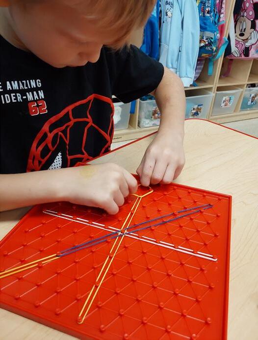 Using GeoBoards to stretch rubber bands helps strengthen the small muscles in the hands. Wikki Stix