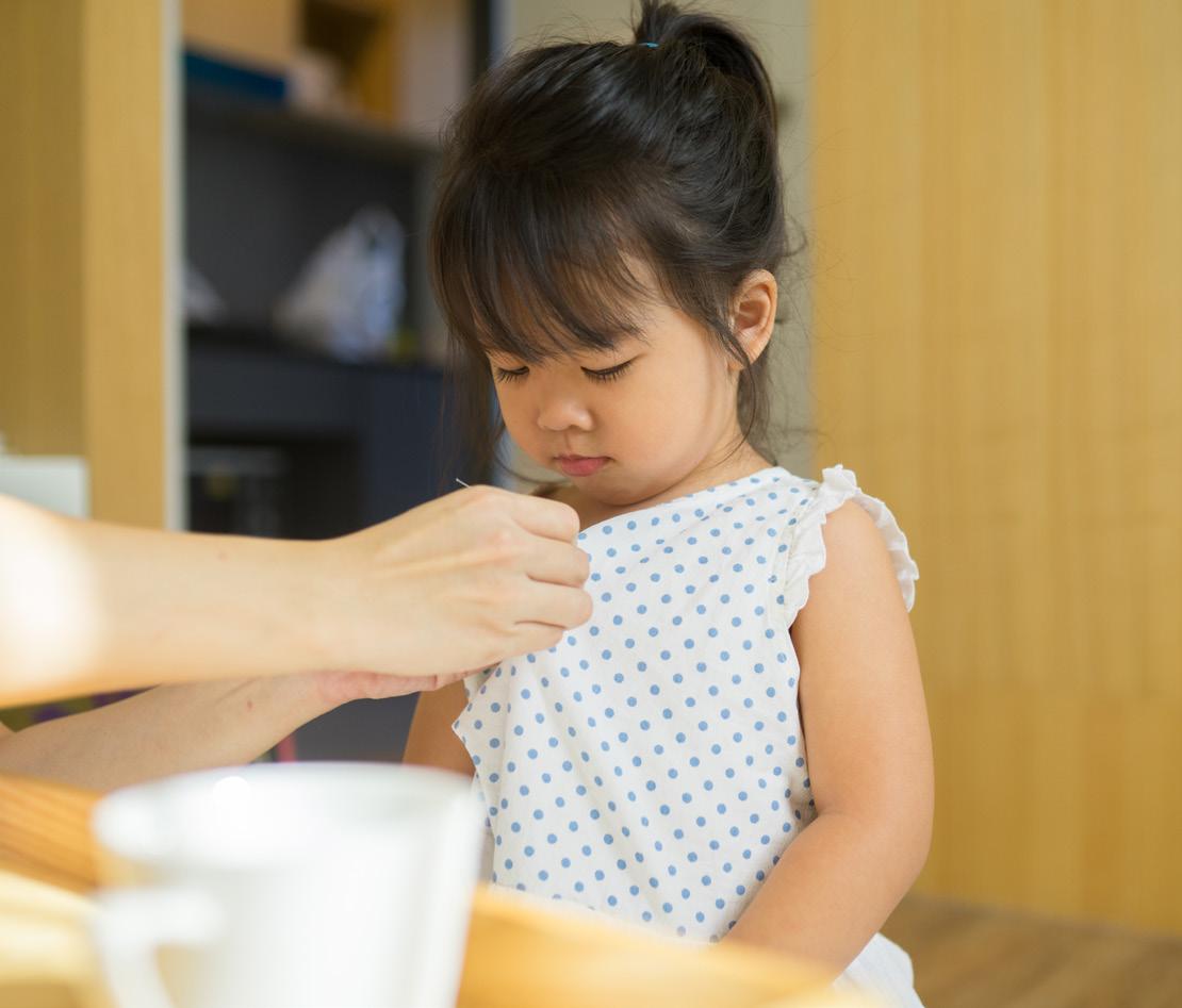 “How many buttons do you have on your shirt? Let’s count them together as we button them up.” (Number—counting)
