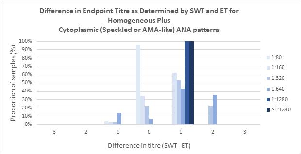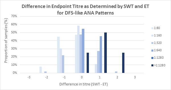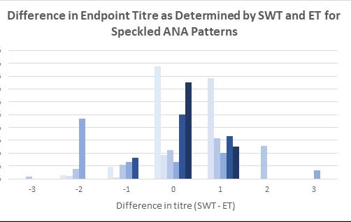 Pathlab implemented restricted used of SWT for ANA endpoint titre determination for patient samples in late 2023. SWT was authorised for use on monospecific homogeneous and dense fine speckled-like patterns of any SWT value, speckled patterns with SWT values of 1:80 or 1:160, centromere patterns with SWT values ≥1:1280, and homogeneous plus cytoplasmic speckled or anti-mitochondrial-like patterns with SWT values of 1:80 or 1:160. Post implementation reagent consumption was also reduced by 20%, and 55% of ANA-positive sample had a one day reduction in turnaround times benefitting the laboratory and reporting.
