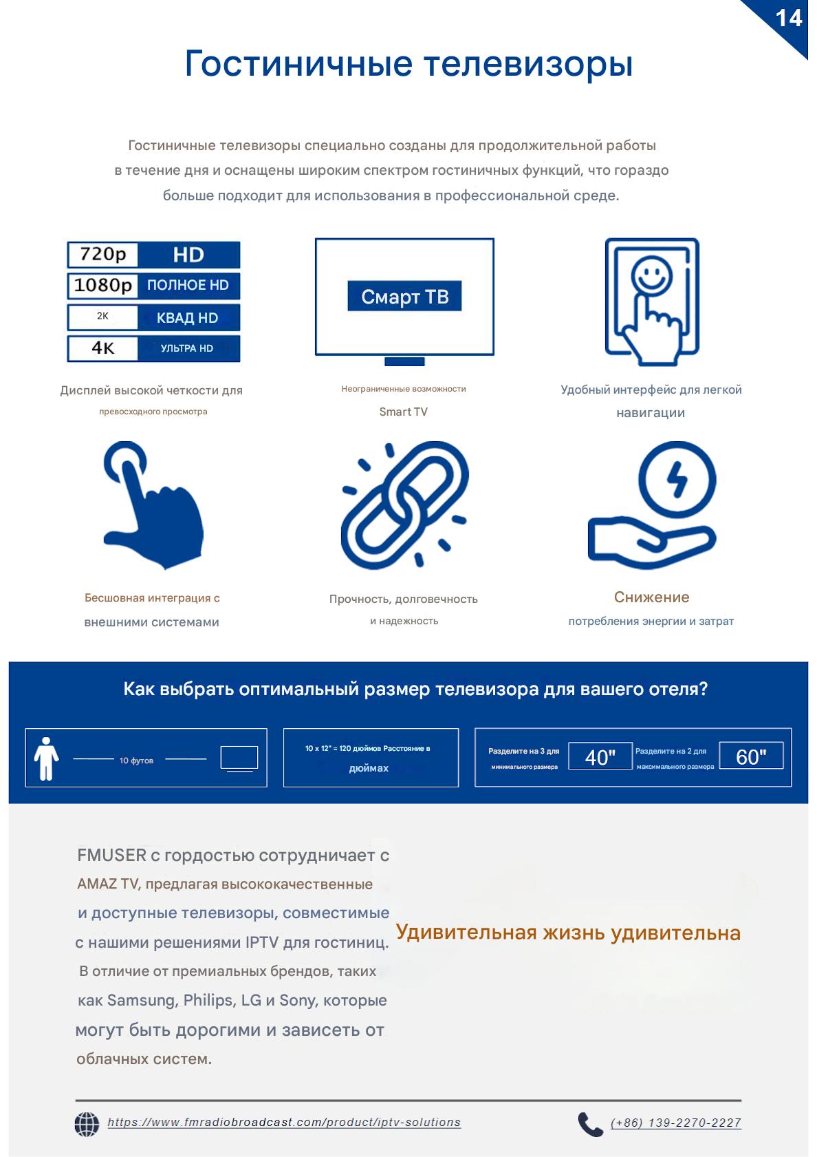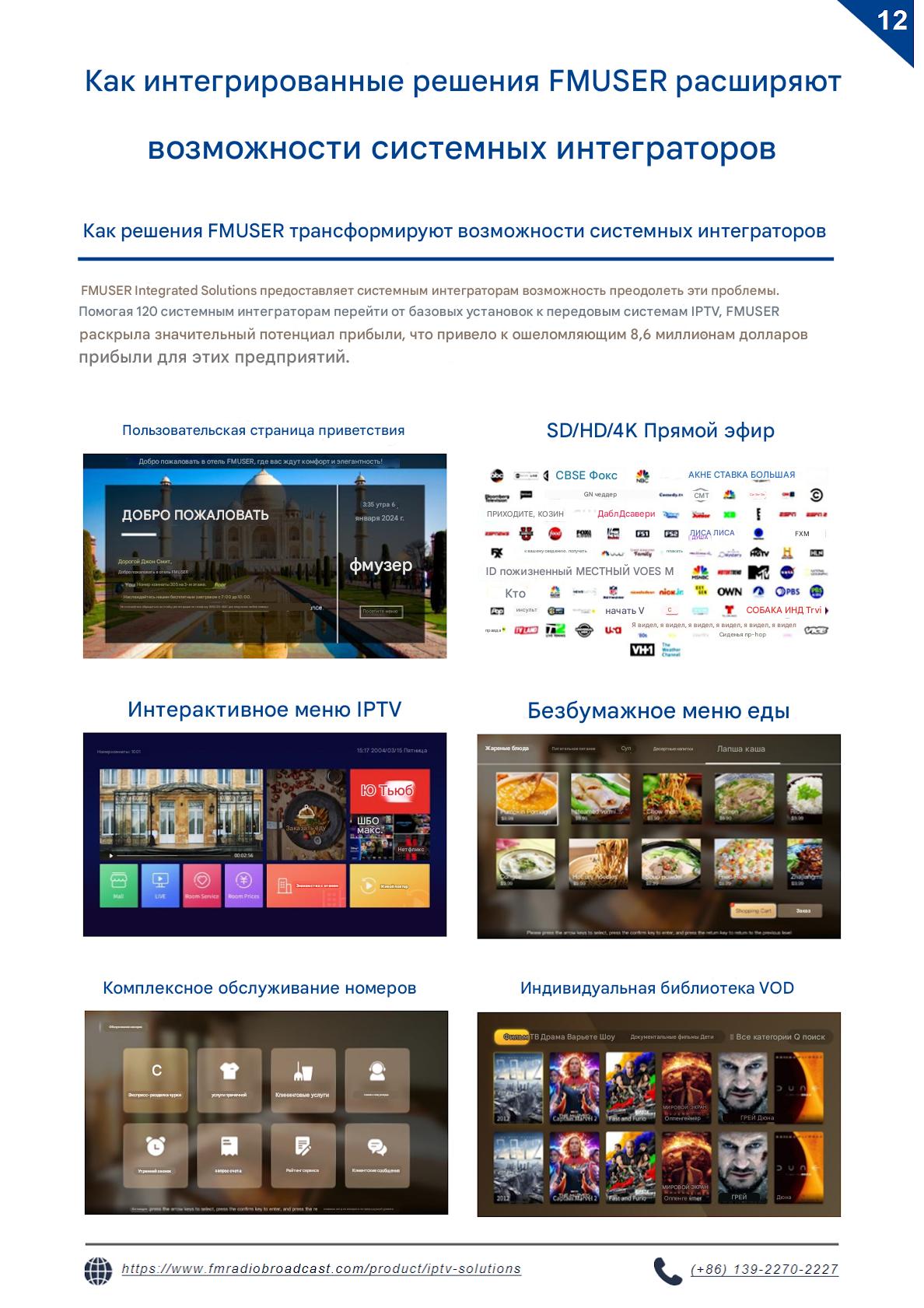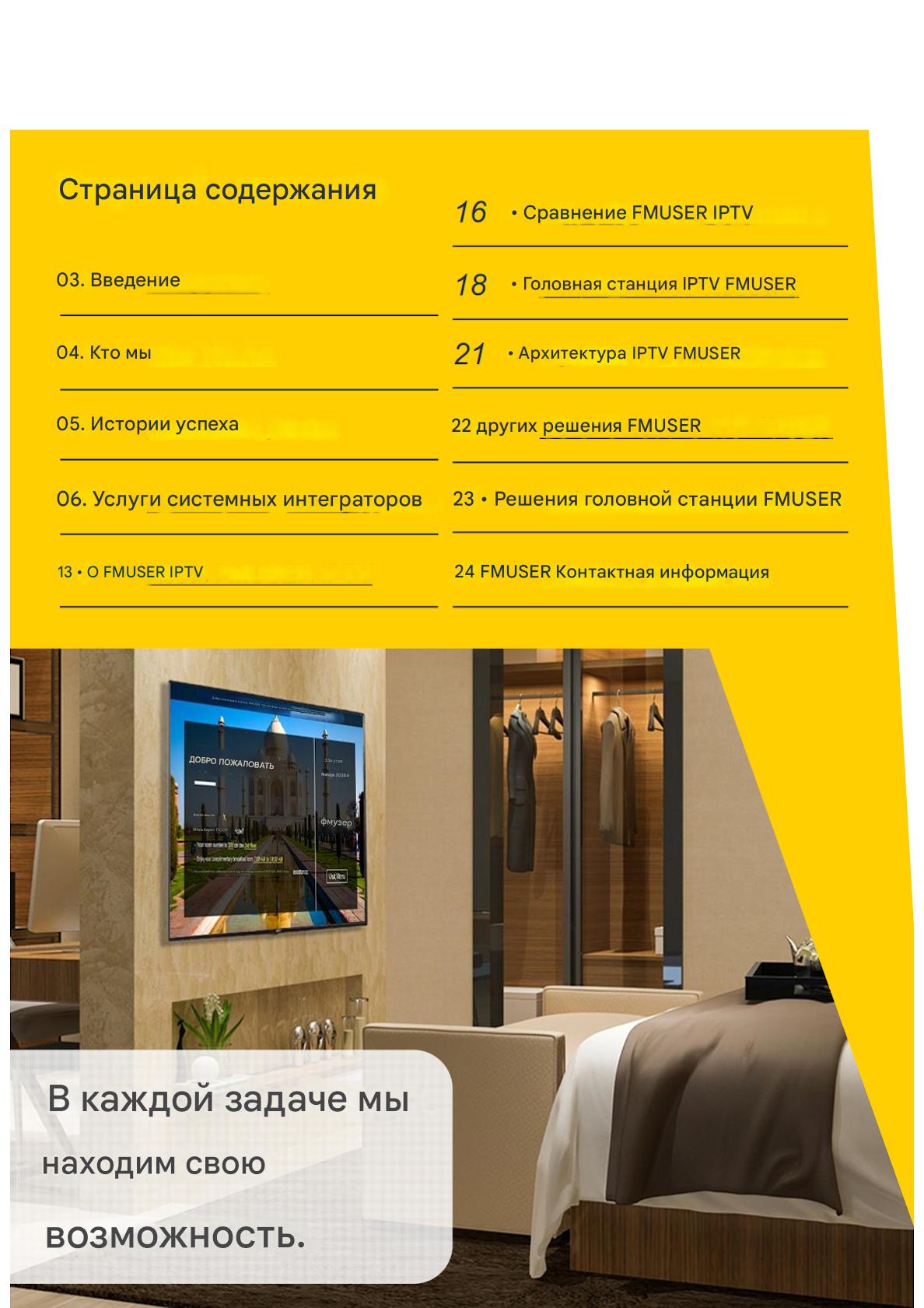 Профессиональные решения IPTV, разработанные для сферы гостеприимства, здравоохранения, судоходства и институциональных приложений. Поддерживает потоковую передачу HD/4K с многоплатформенной совместимостью, централизованным управлением и безопасным распространением контента в корпоративных/государственных сетях.