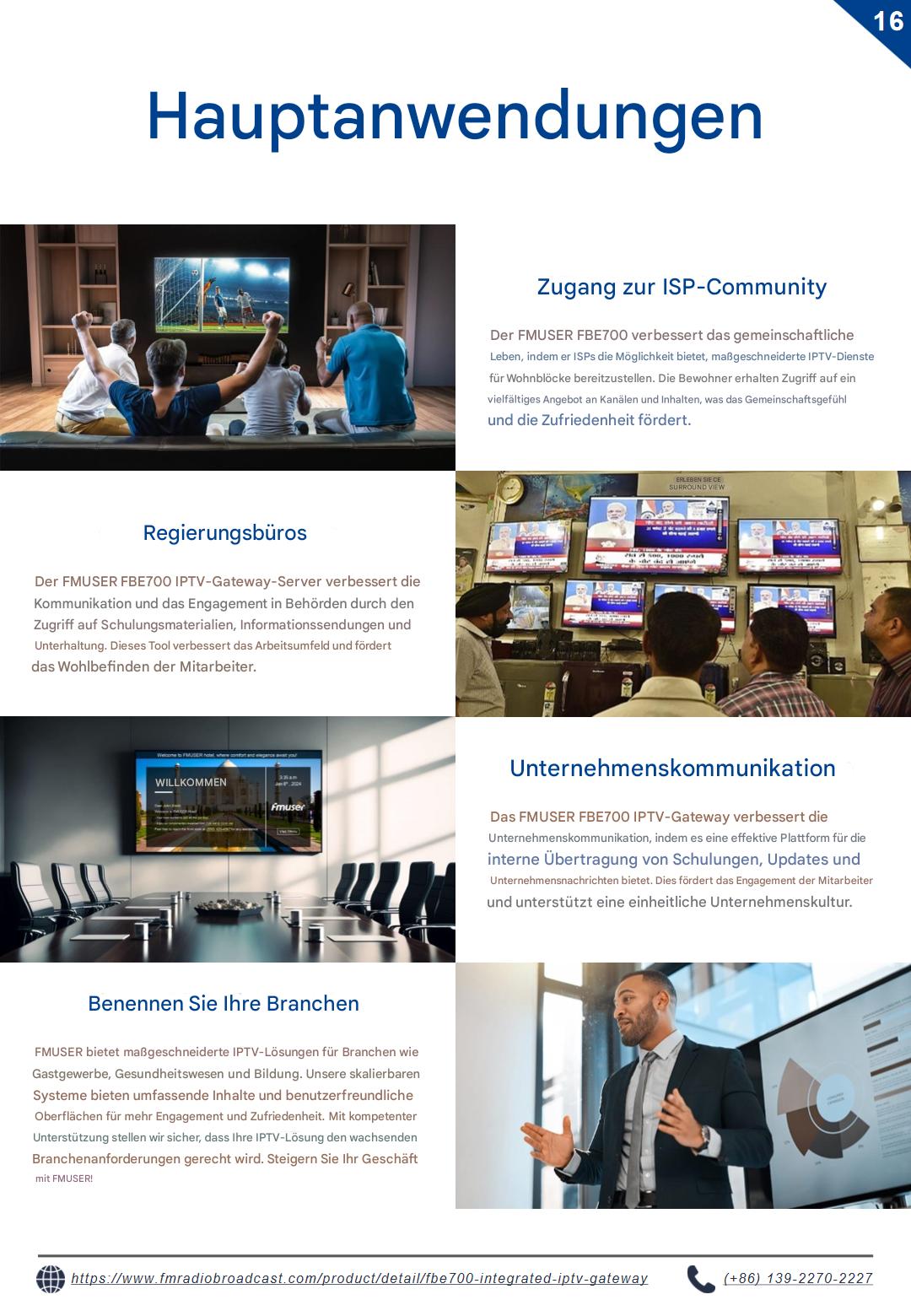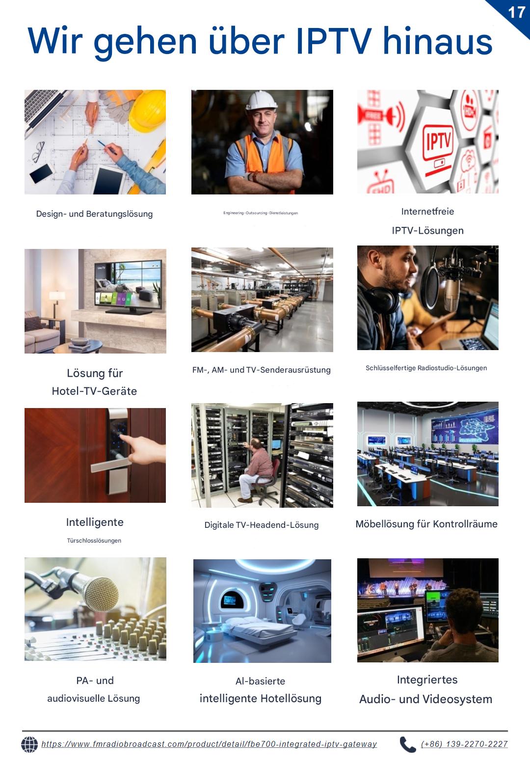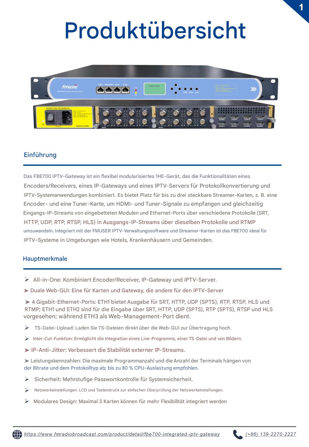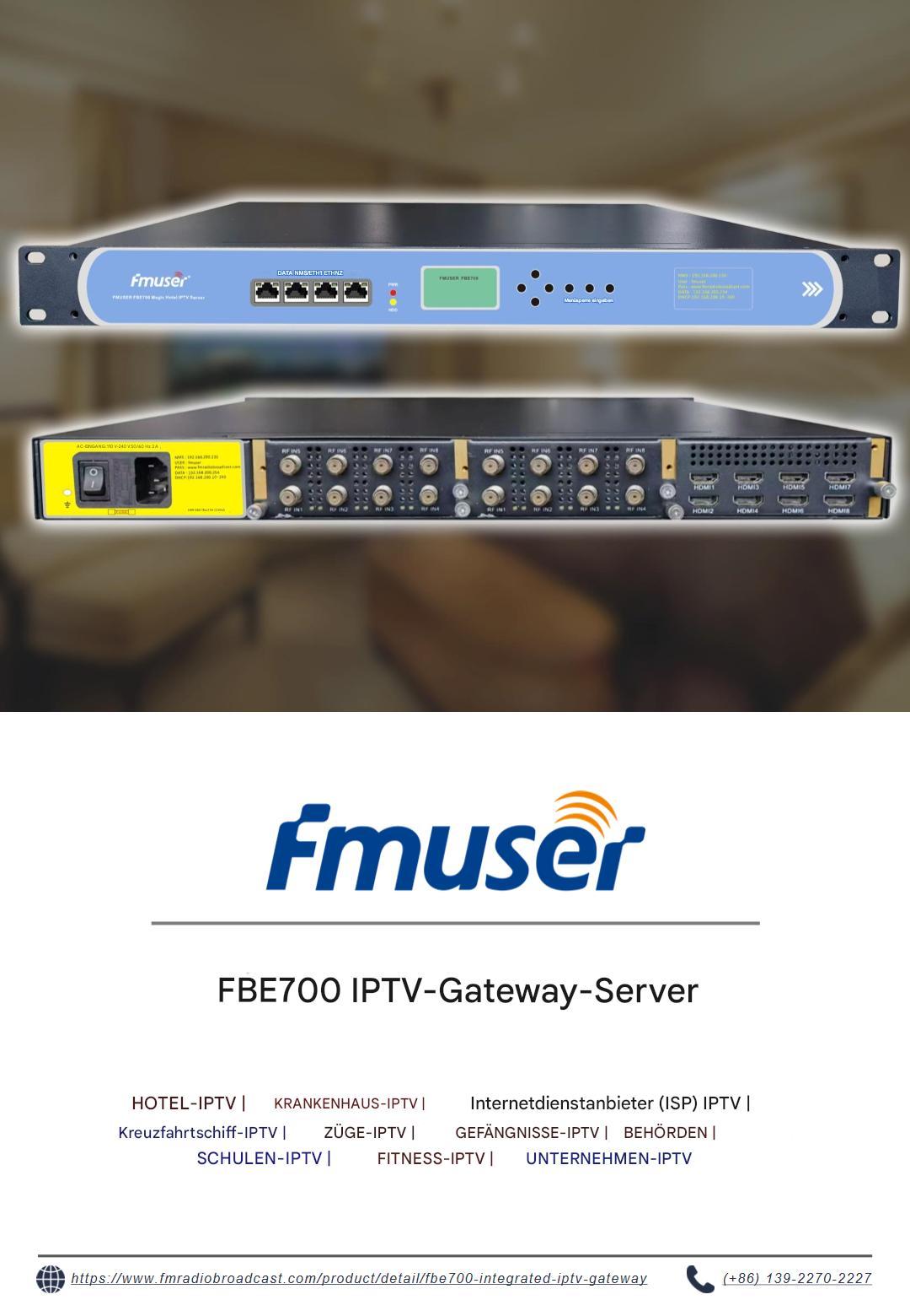 Entdecken Sie den FBE700 IPTV-Gateway-Server, der für verschiedene Branchen wie Hotels, Krankenhäuser, Internetanbieter und Kreuzfahrtschiffe entwickelt wurde. Diese Enterprise-Lösung wurde für die zuverlässige Verbreitung digitaler Inhalte in anspruchsvollen Umgebungen entwickelt und unterstützt skalierbare Implementierungen in Justizvollzugsanstalten, Bildungseinrichtungen und Behörden. Robuste Leistung erfüllt die Anforderungen kritischer Infrastrukturen.