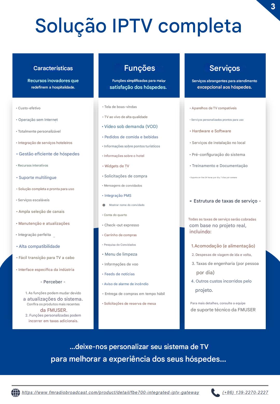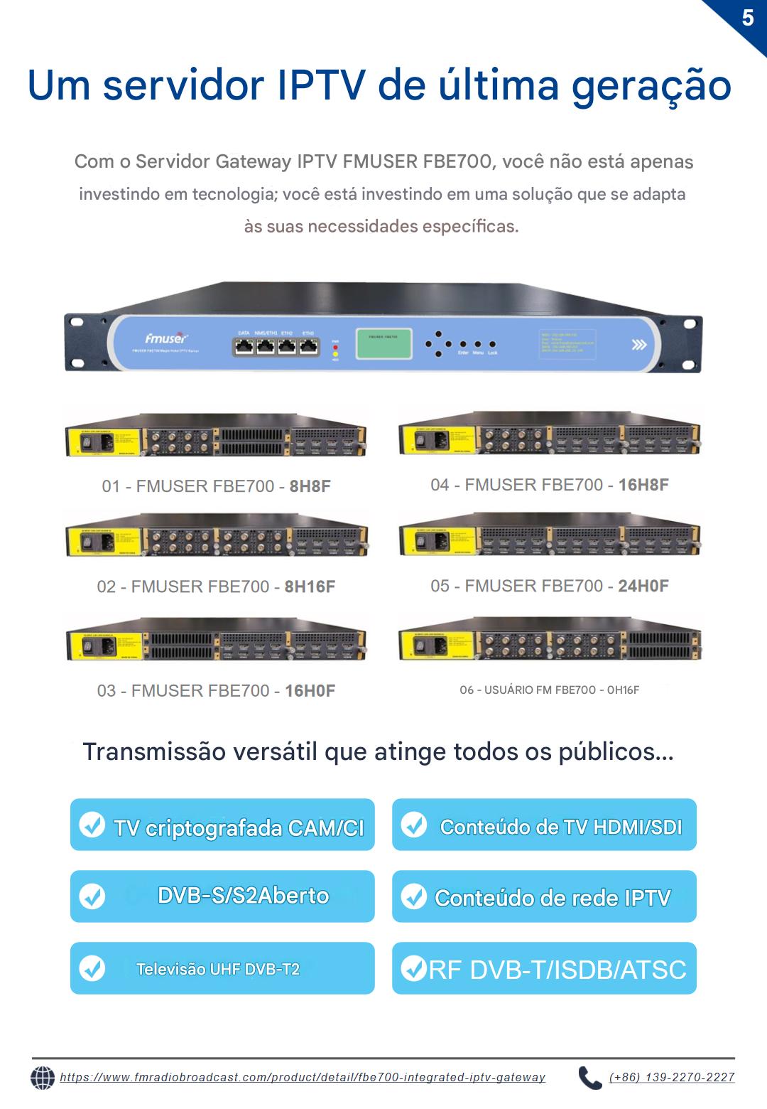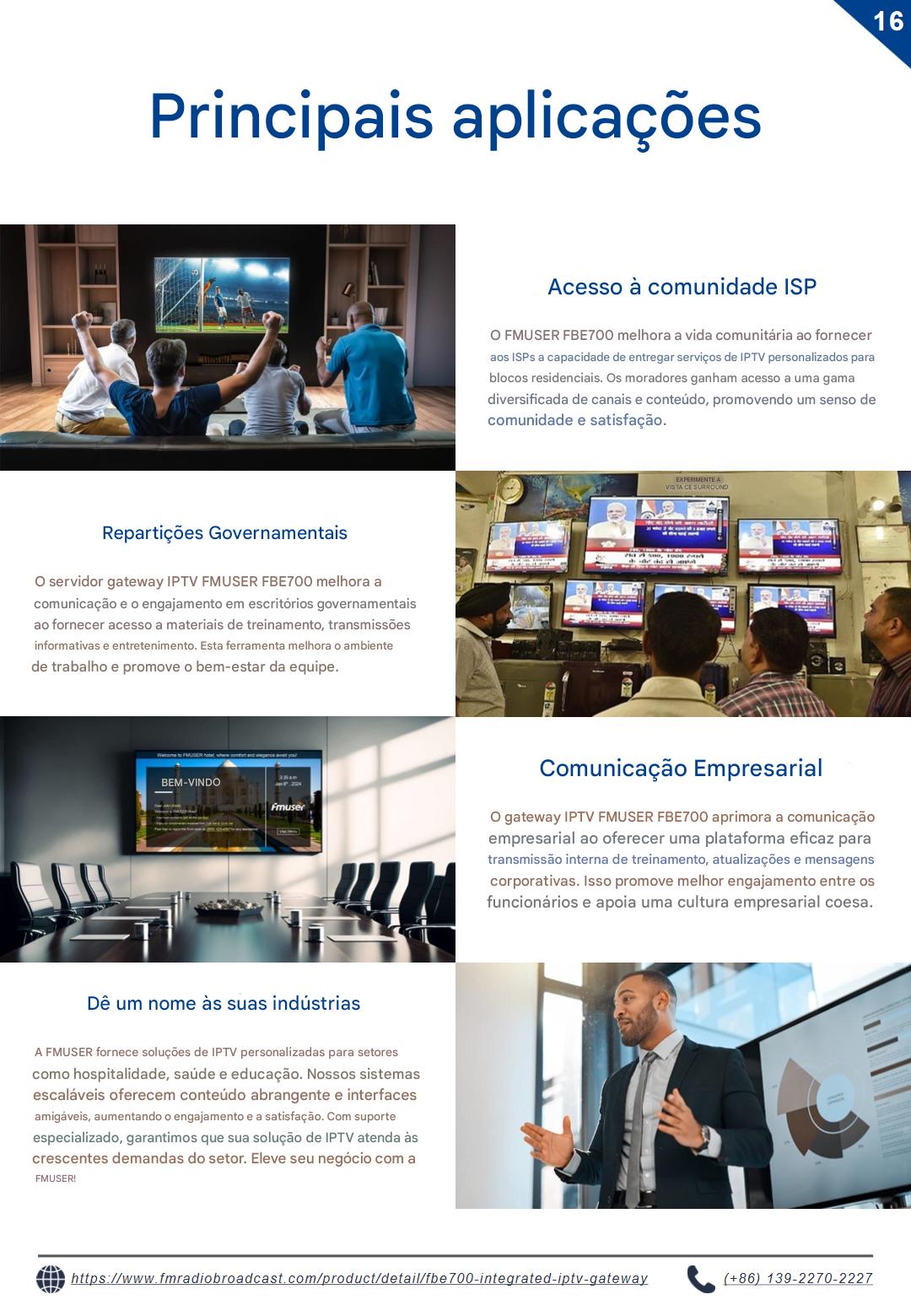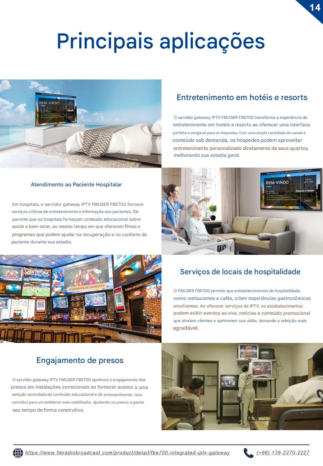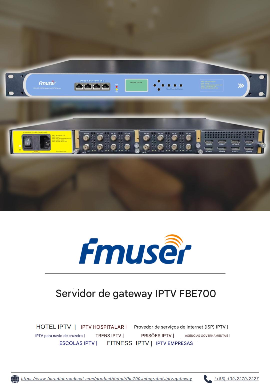 Explore o FBE700 IPTV Gateway Server projetado para diversos setores, incluindo hotéis, hospitais, ISPs e navios de cruzeiro. Projetado para fornecer distribuição confiável de conteúdo digital em ambientes exigentes, esta solução de nível empresarial suporta implantações escaláveis em instalações correcionais, instituições educacionais e agências governamentais. O desempenho robusto atende aos requisitos de infraestrutura crítica.