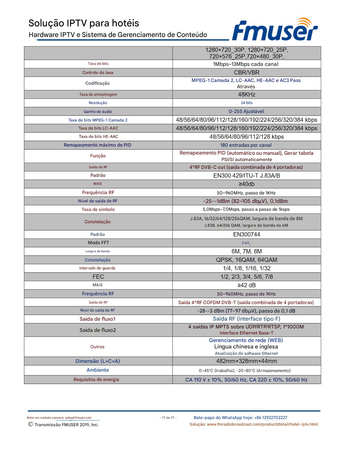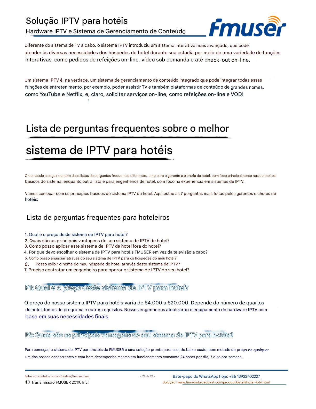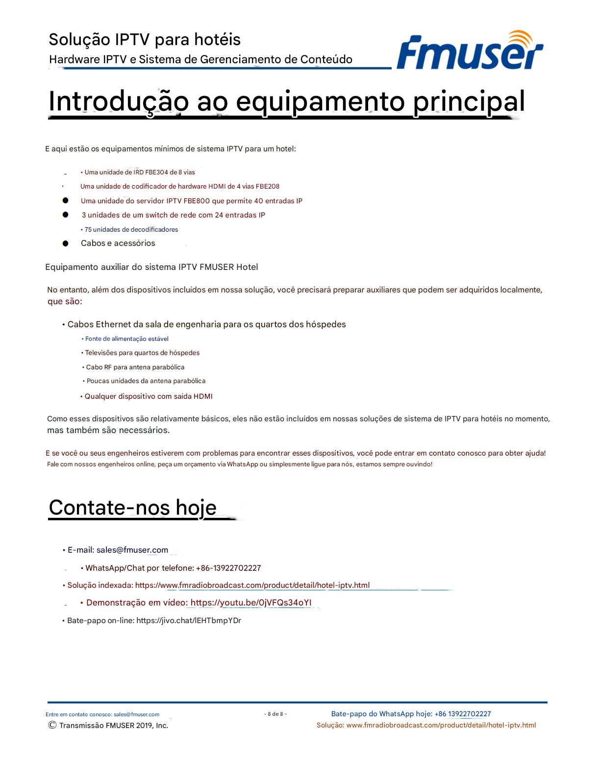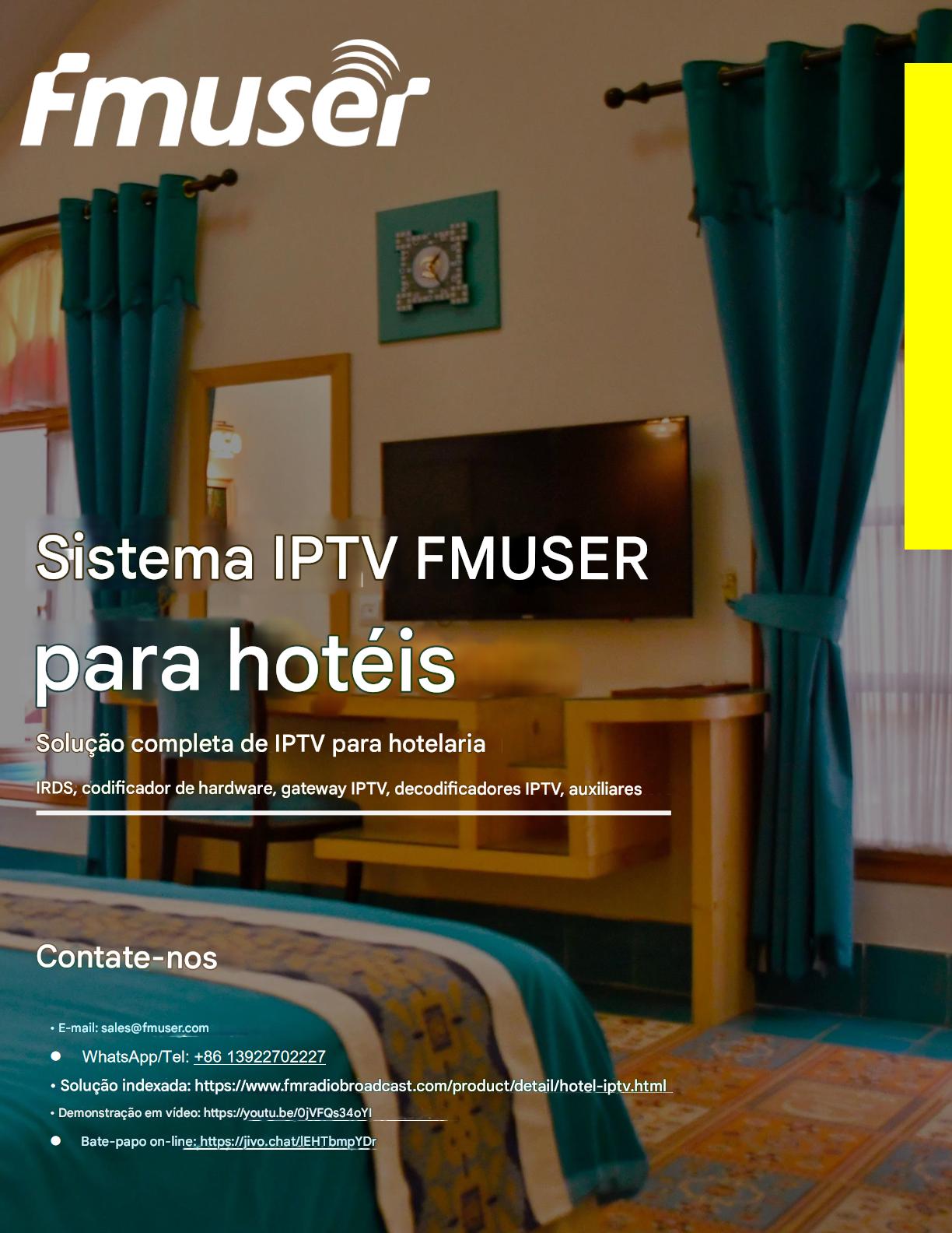 A FMUSER fornece uma solução completa de IPTV para engenheiros de hotéis, apresentando IRDs de nível de transmissão, codificadores de hardware, gateways de IPTV e decodificadores comerciais. Projetada para integradores de sistemas, essa arquitetura escalável oferece suporte a streaming HD/4K, gerenciamento centralizado e integração perfeita com sistemas PMS/CAS de hotéis. Explore soluções de distribuição de vídeo de nível profissional.
