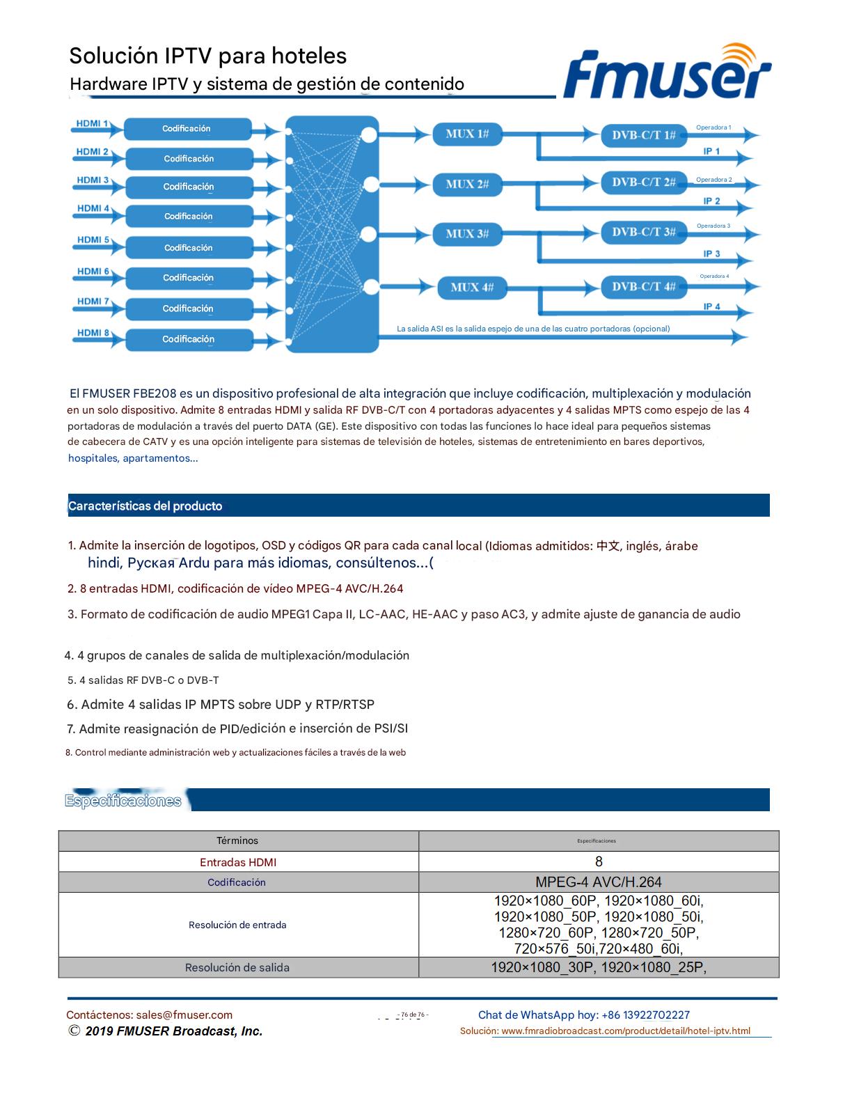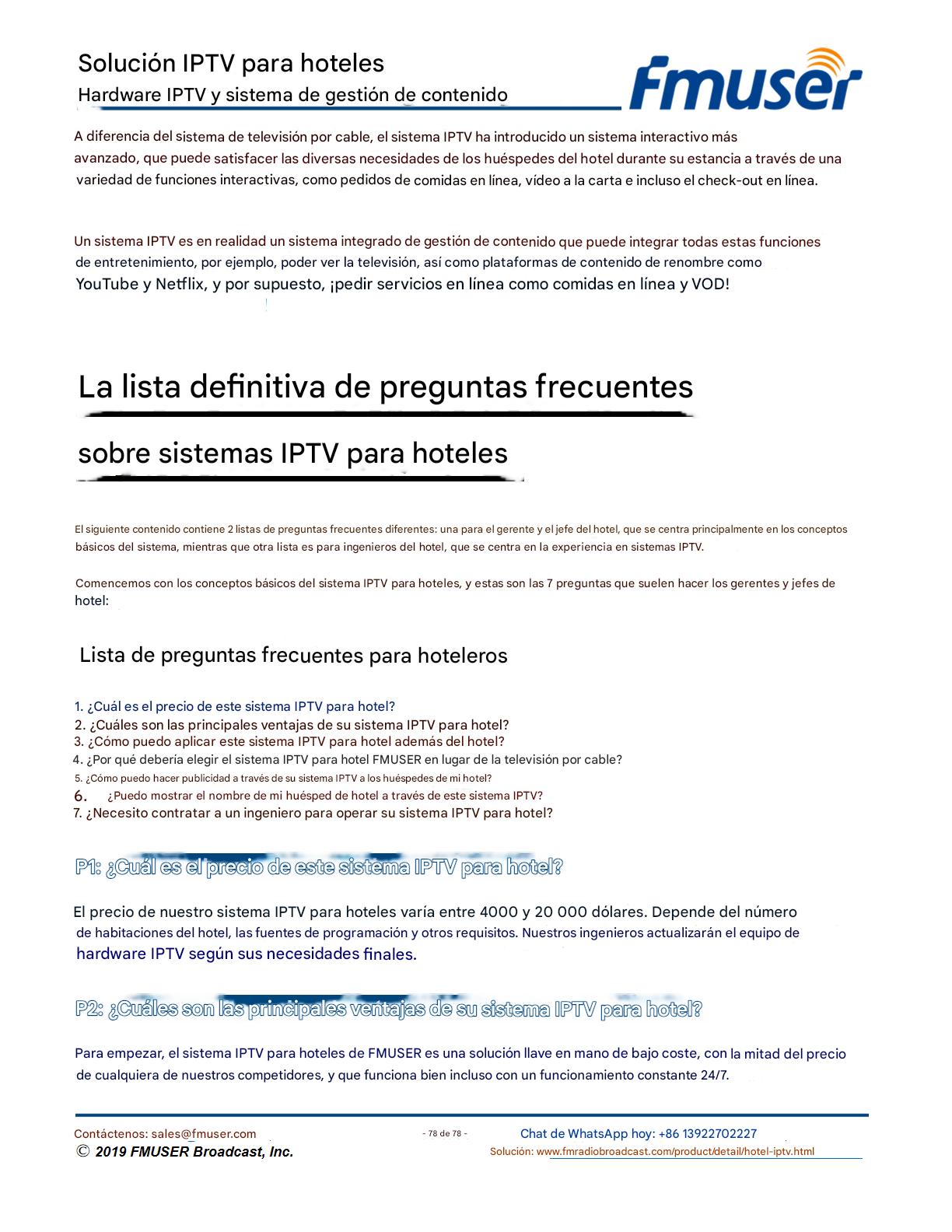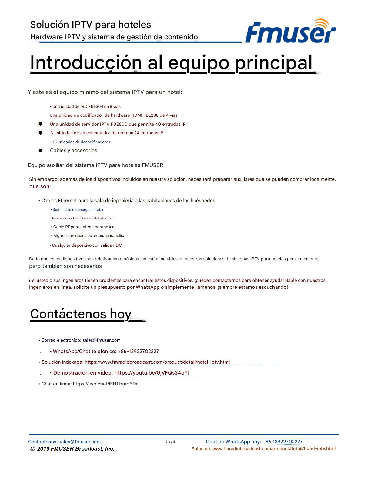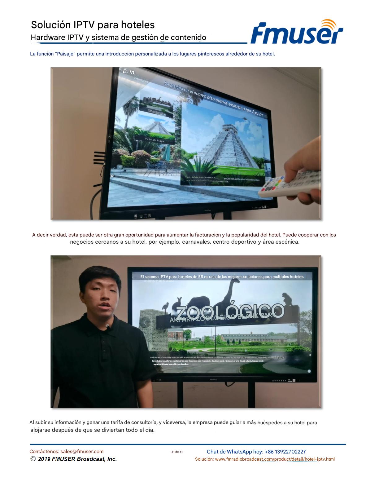 FMUSER ofrece una solución completa de IPTV para ingenieros hoteleros, con IRD de alta calidad, codificadores de hardware, puertas de enlace IPTV y decodificadores comerciales. Diseñada para integradores de sistemas, esta arquitectura escalable admite streaming HD/4K, gestión centralizada e integración fluida con sistemas PMS/CAS de hoteles. Explore soluciones de distribución de video de nivel profesional.
