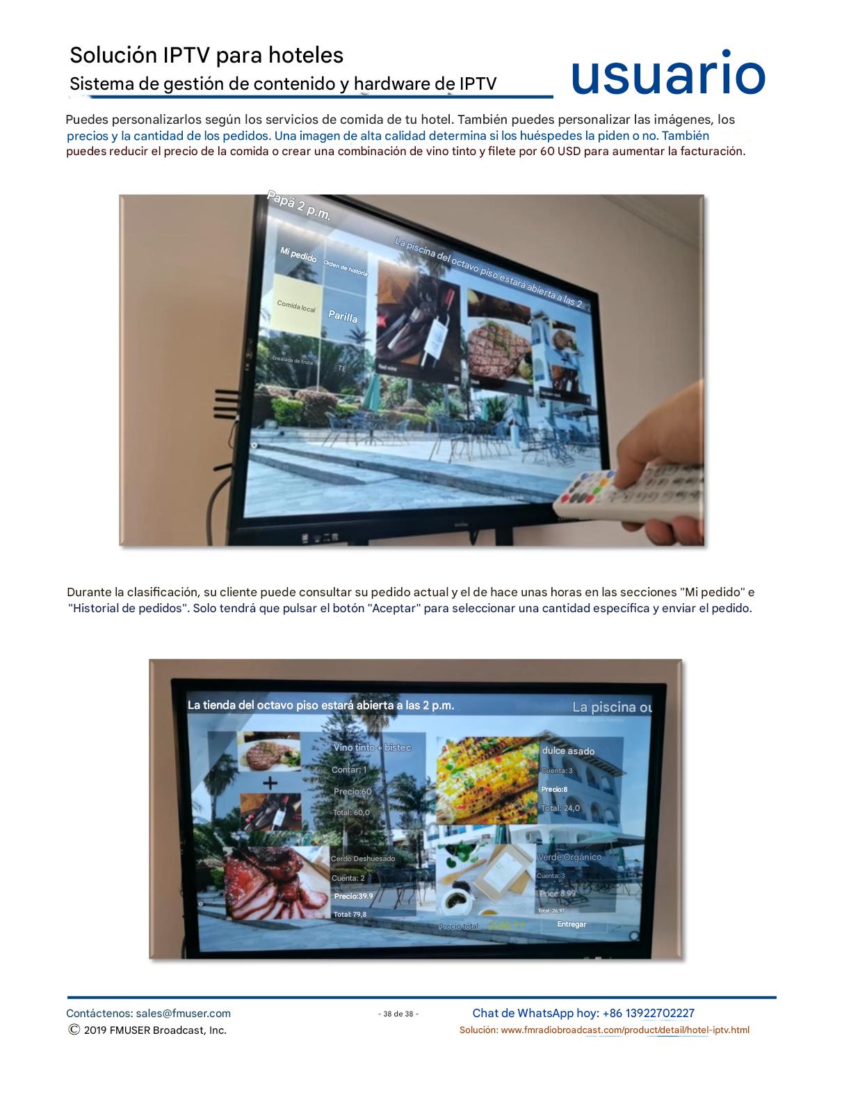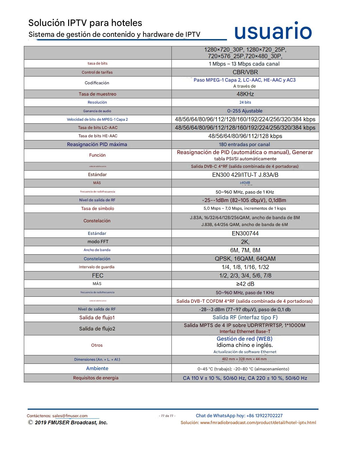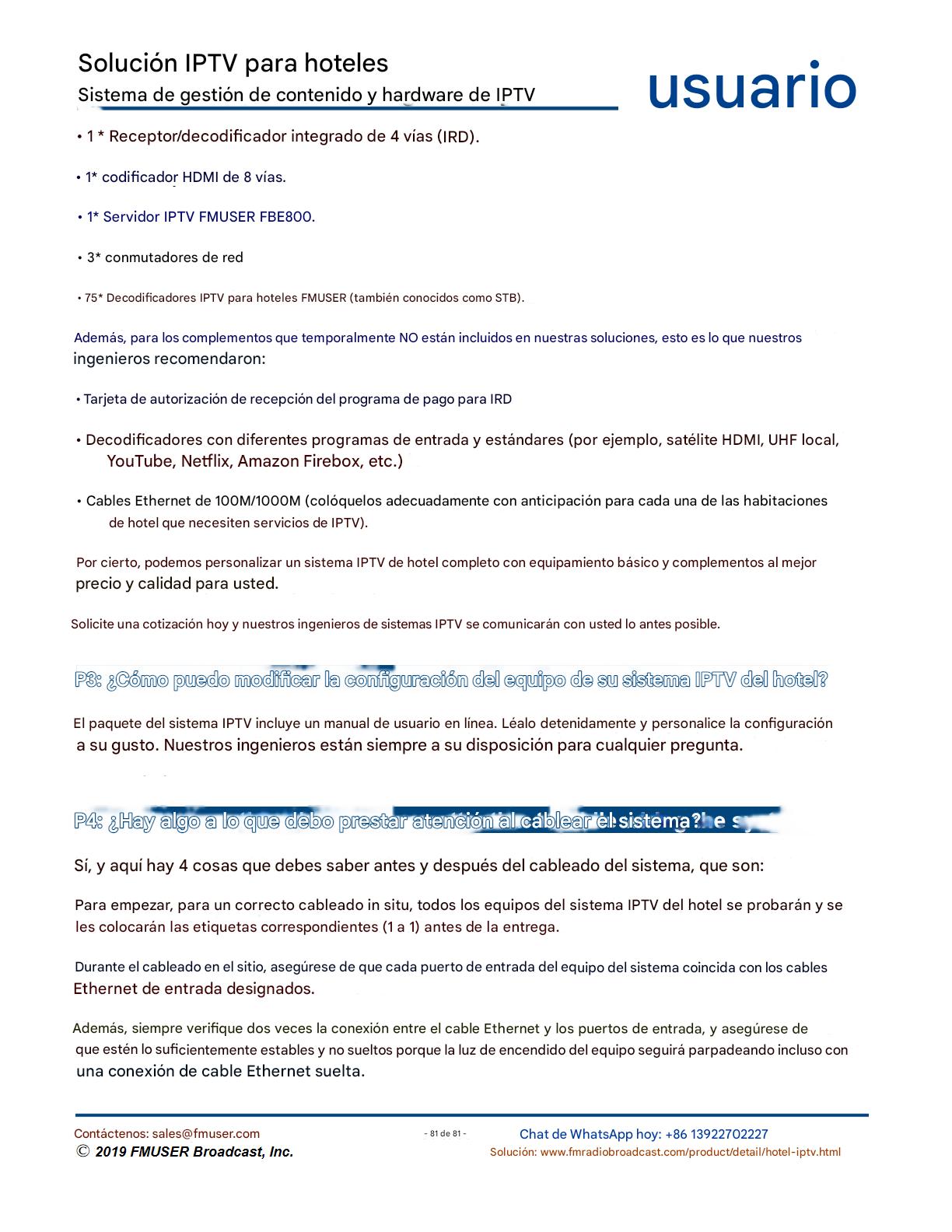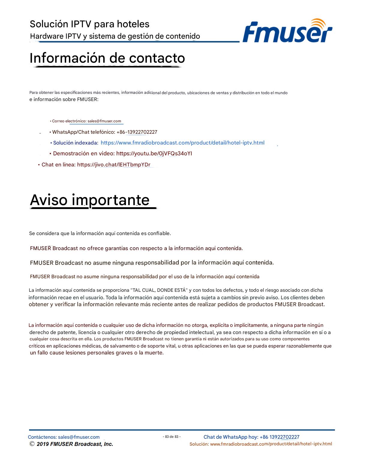 FMUSER ofrece una solución completa de IPTV para ingenieros hoteleros, con IRD de alta calidad, codificadores de hardware, puertas de enlace IPTV y decodificadores comerciales. Diseñada para integradores de sistemas, esta arquitectura escalable admite streaming HD/4K, gestión centralizada e integración fluida con sistemas PMS/CAS de hoteles. Explore soluciones de distribución de video de nivel profesional.