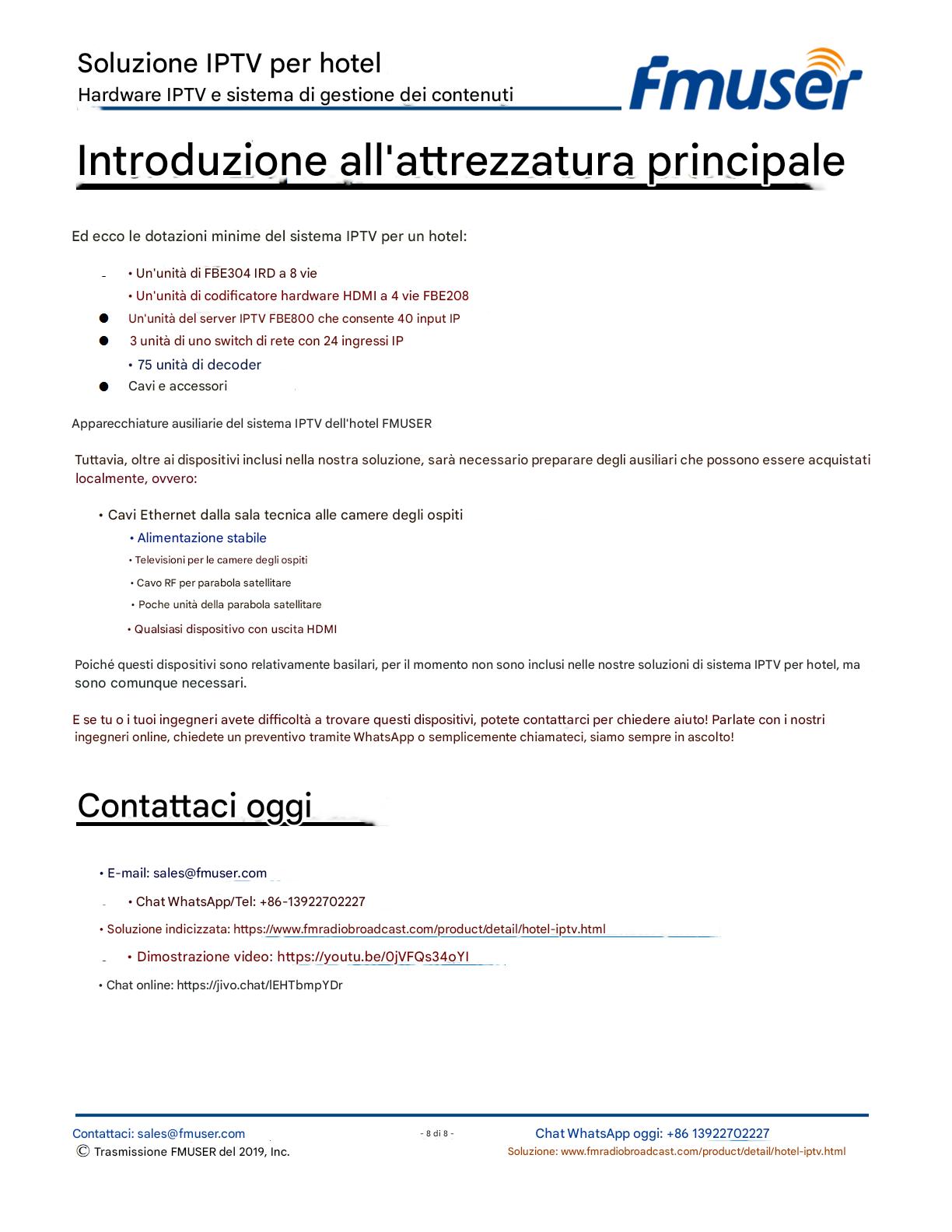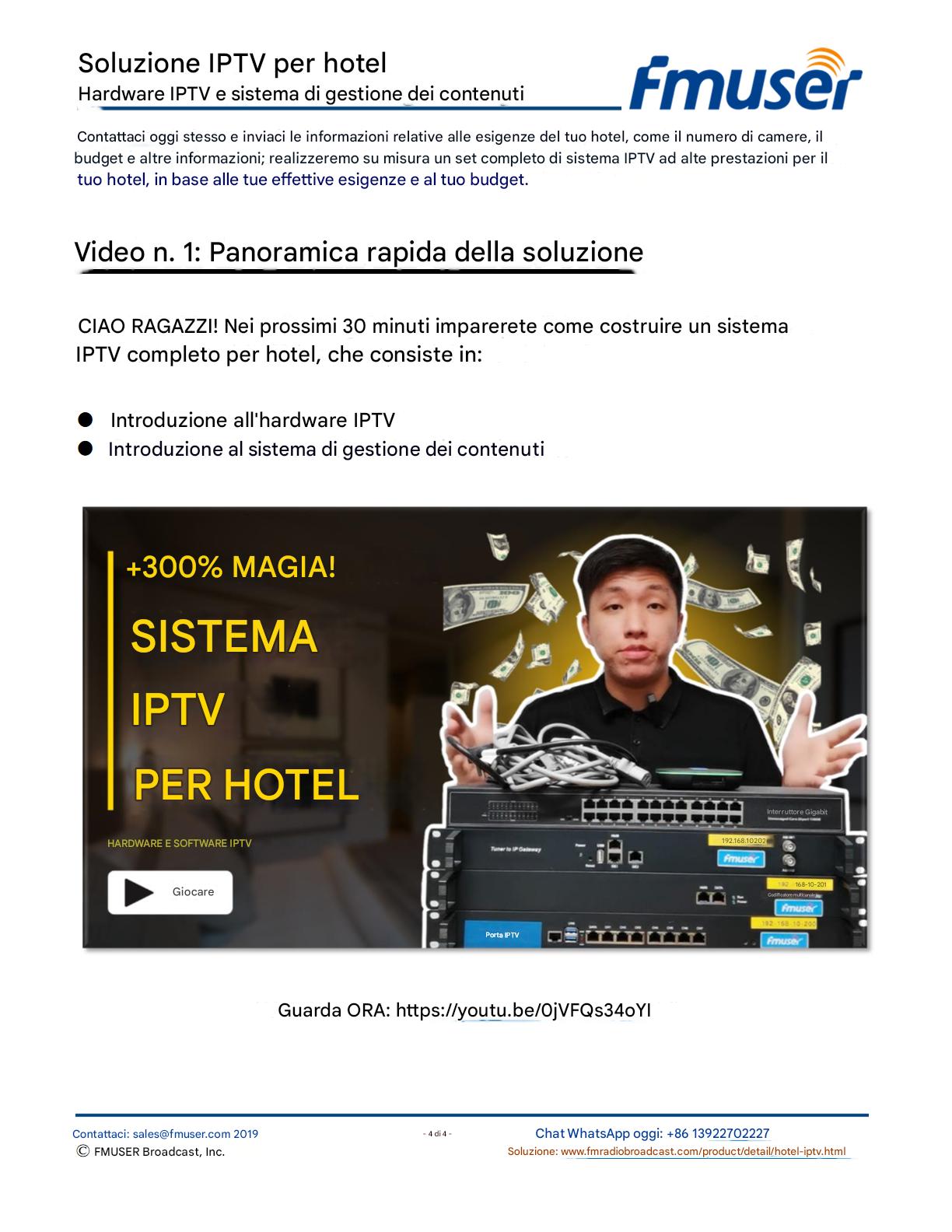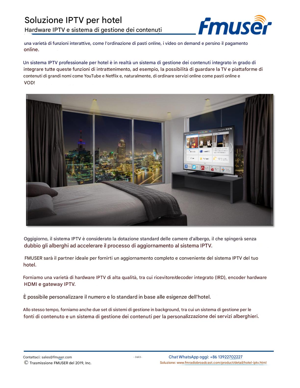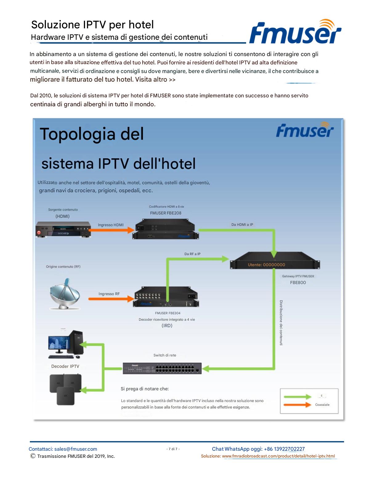 FMUSER offre una soluzione IPTV completa per gli ingegneri alberghieri, con IRD di livello broadcast, codificatori hardware, gateway IPTV e decoder commerciali. Progettata per gli integratori di sistema, questa architettura scalabile supporta lo streaming HD/4K, la gestione centralizzata e l'integrazione senza soluzione di continuità con i sistemi PMS/CAS degli hotel. Esplora soluzioni di distribuzione video di livello professionale.