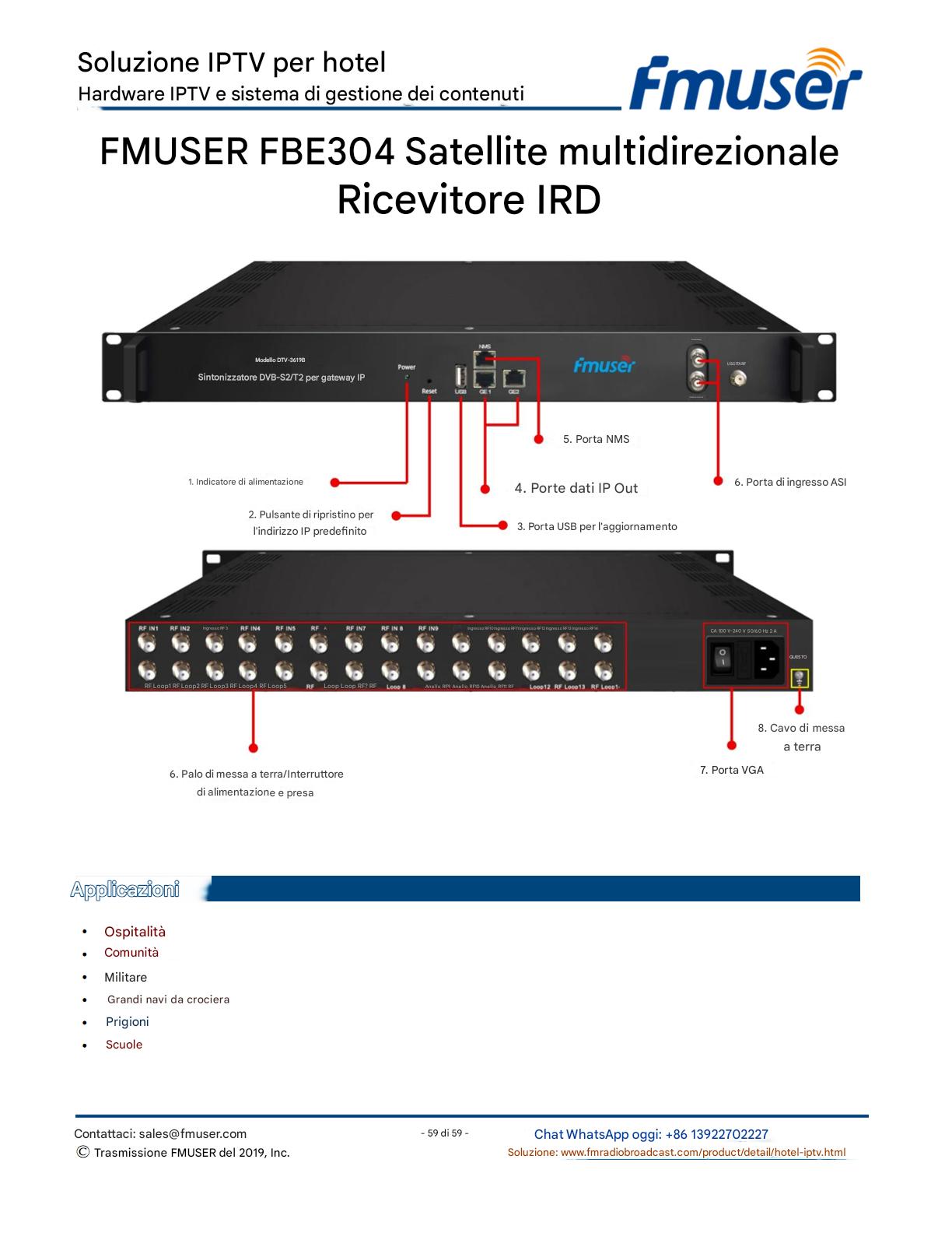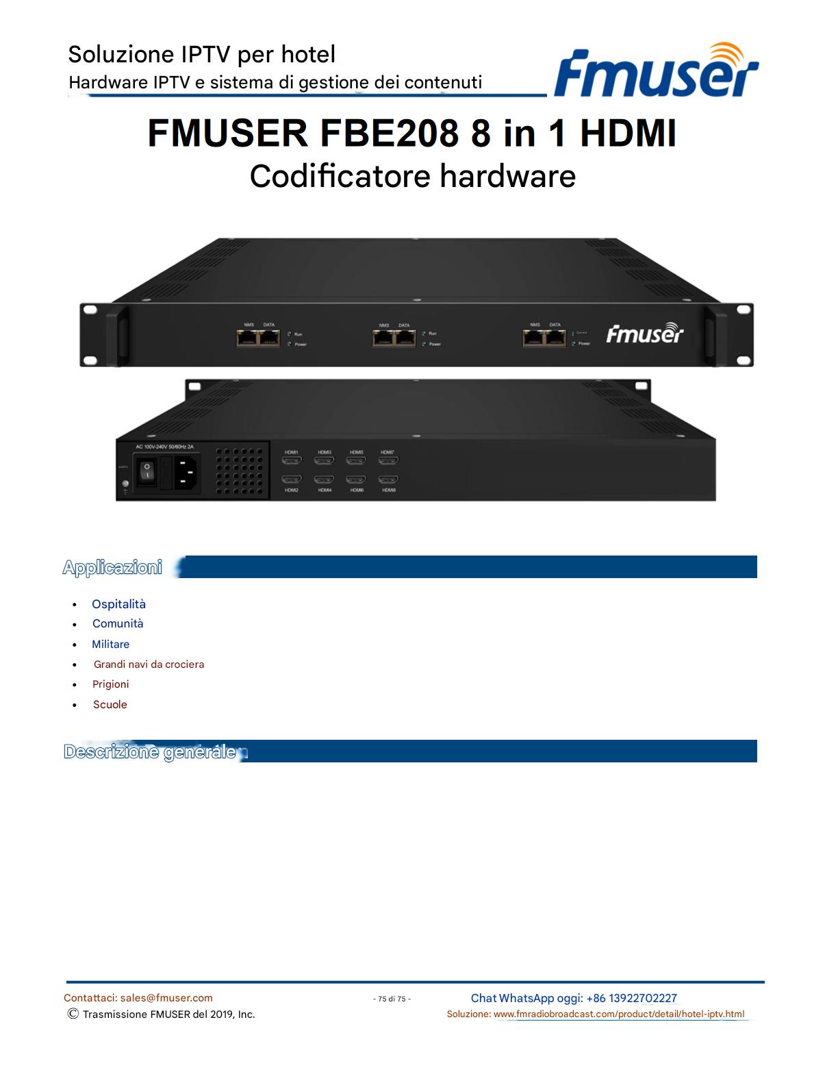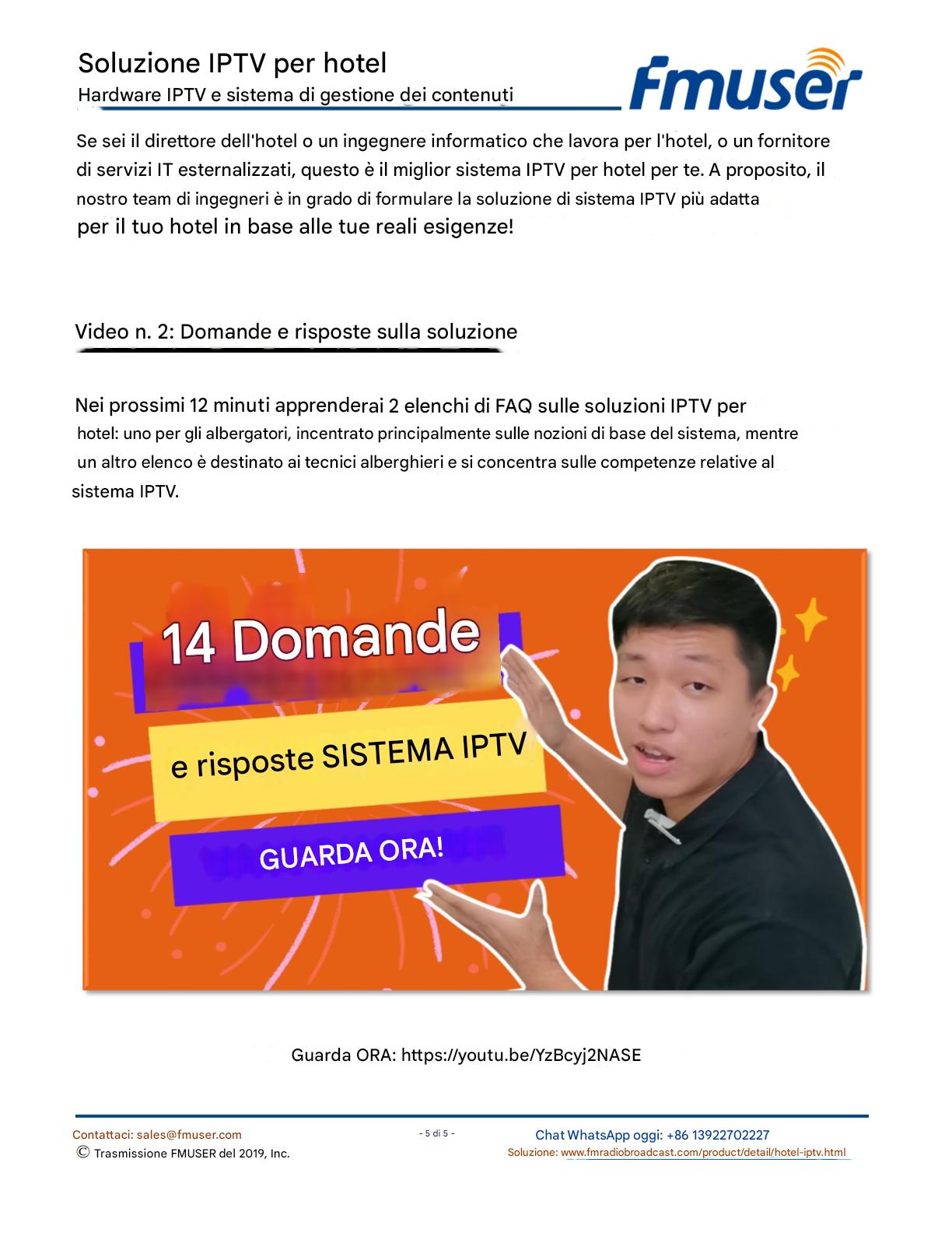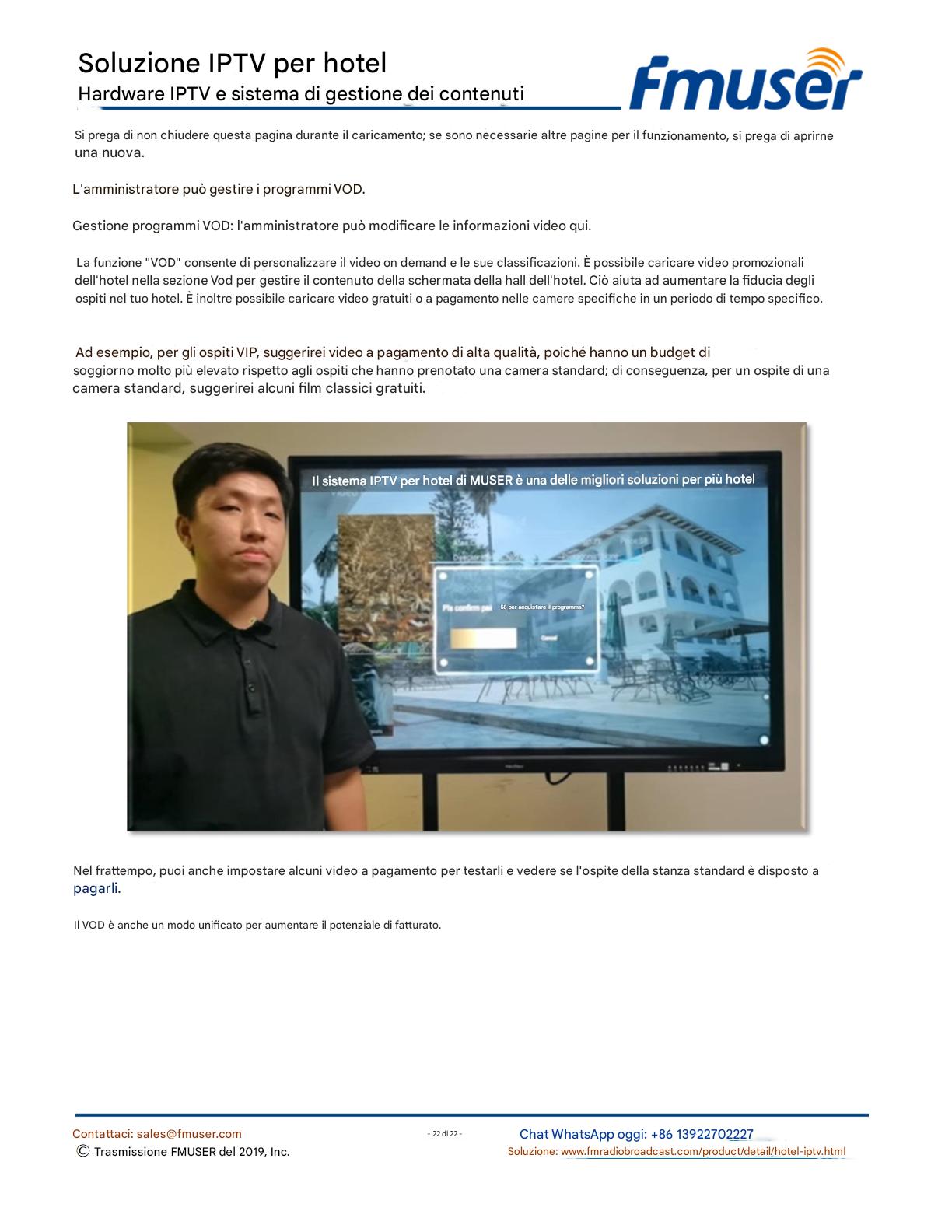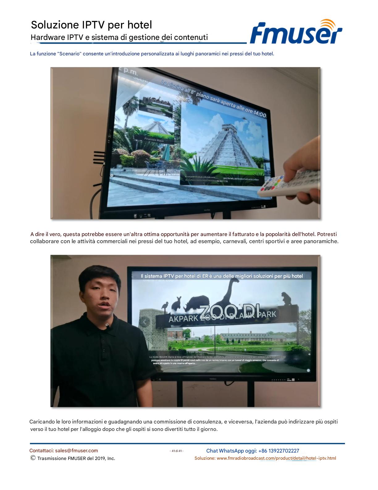 FMUSER offre una soluzione IPTV completa per gli ingegneri alberghieri, con IRD di livello broadcast, codificatori hardware, gateway IPTV e decoder commerciali. Progettata per gli integratori di sistema, questa architettura scalabile supporta lo streaming HD/4K, la gestione centralizzata e l'integrazione senza soluzione di continuità con i sistemi PMS/CAS degli hotel. Esplora soluzioni di distribuzione video di livello professionale.
