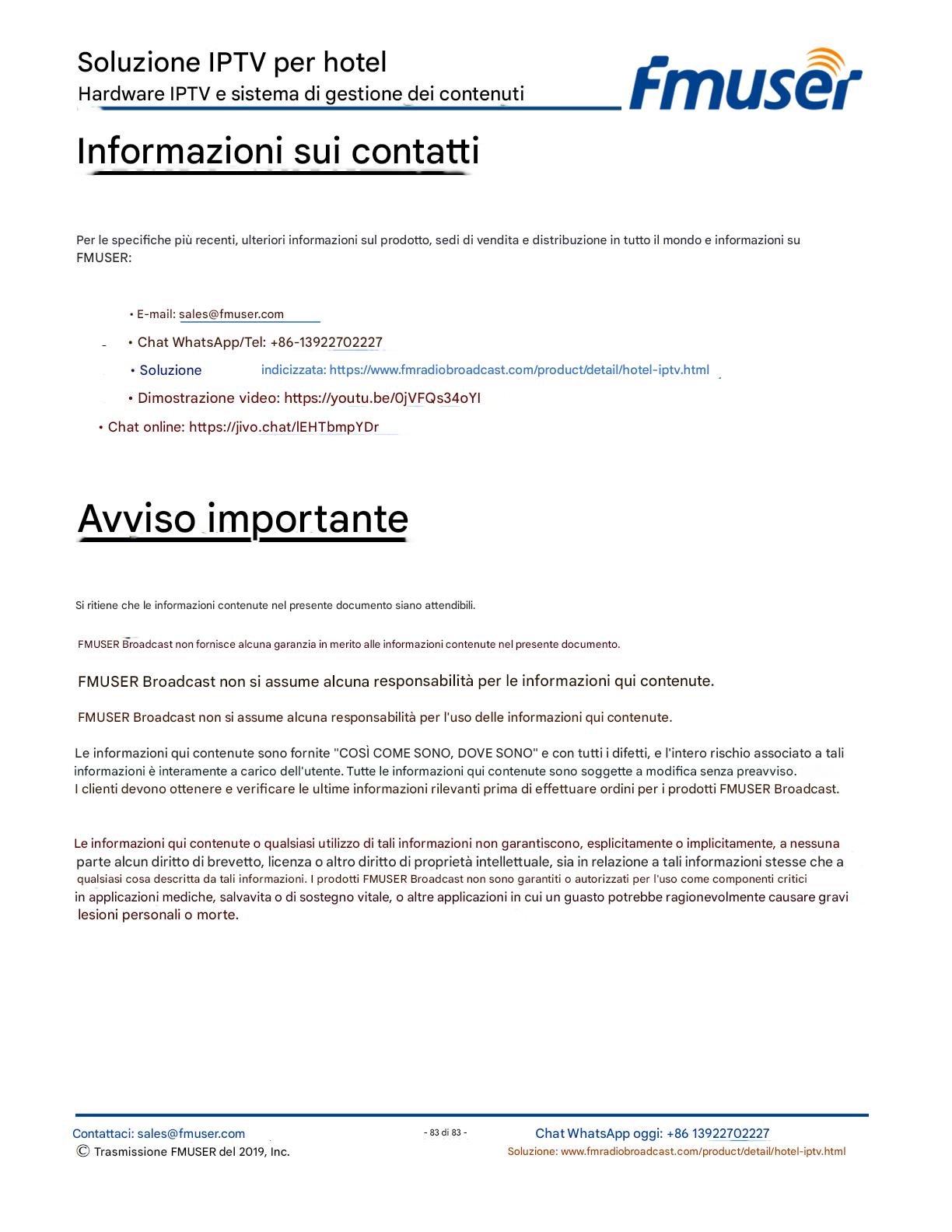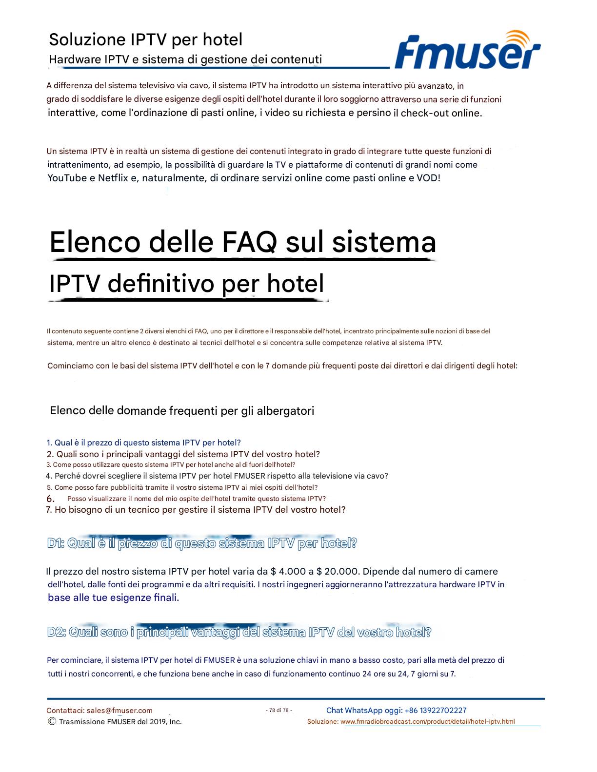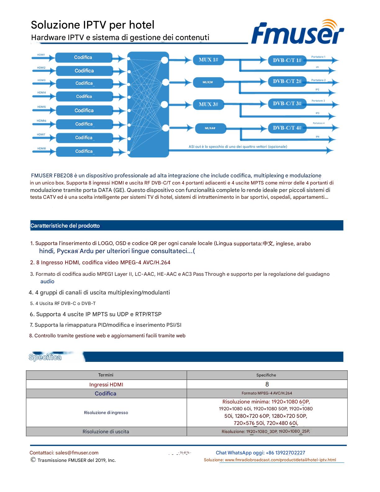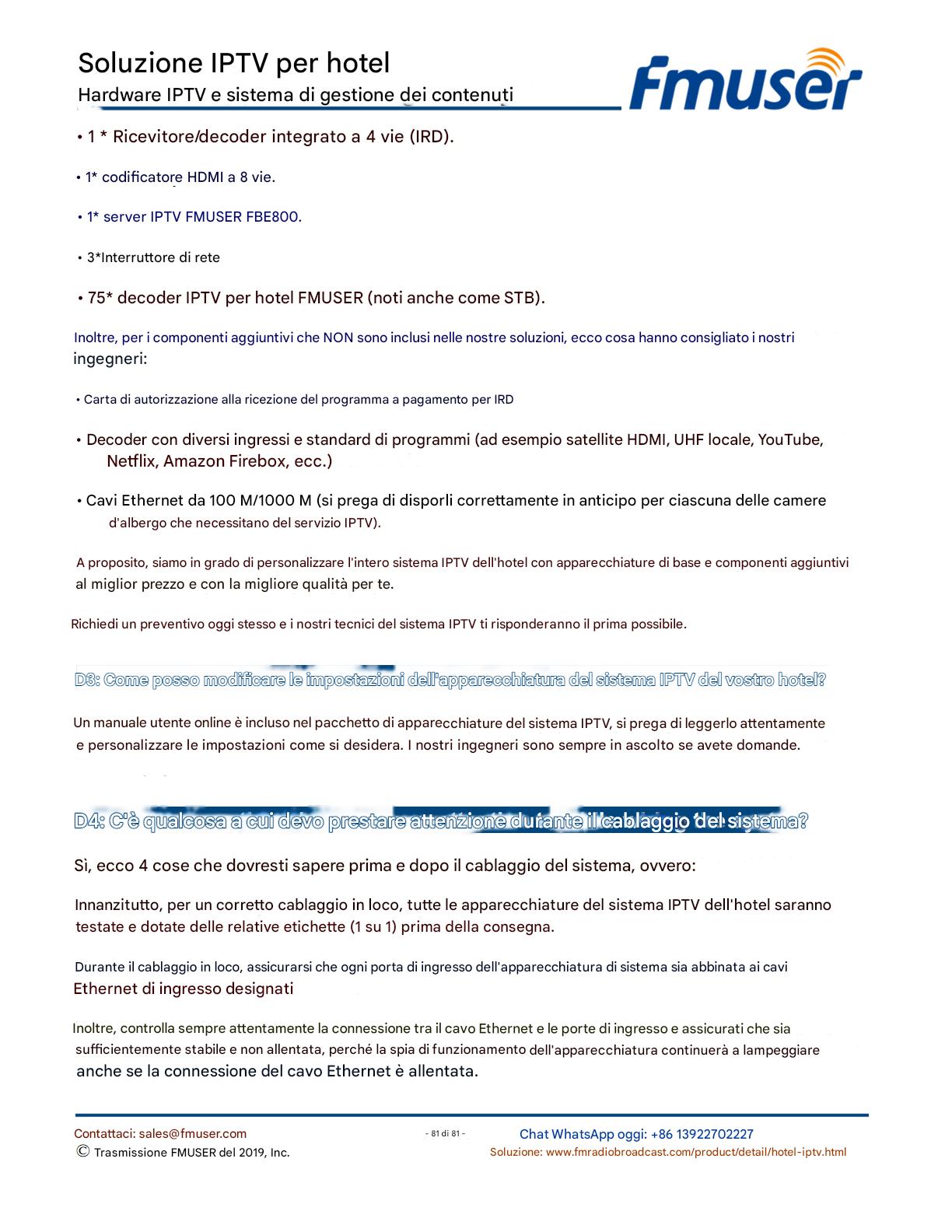 FMUSER offre una soluzione IPTV completa per gli ingegneri alberghieri, con IRD di livello broadcast, codificatori hardware, gateway IPTV e decoder commerciali. Progettata per gli integratori di sistema, questa architettura scalabile supporta lo streaming HD/4K, la gestione centralizzata e l'integrazione senza soluzione di continuità con i sistemi PMS/CAS degli hotel. Esplora soluzioni di distribuzione video di livello professionale.