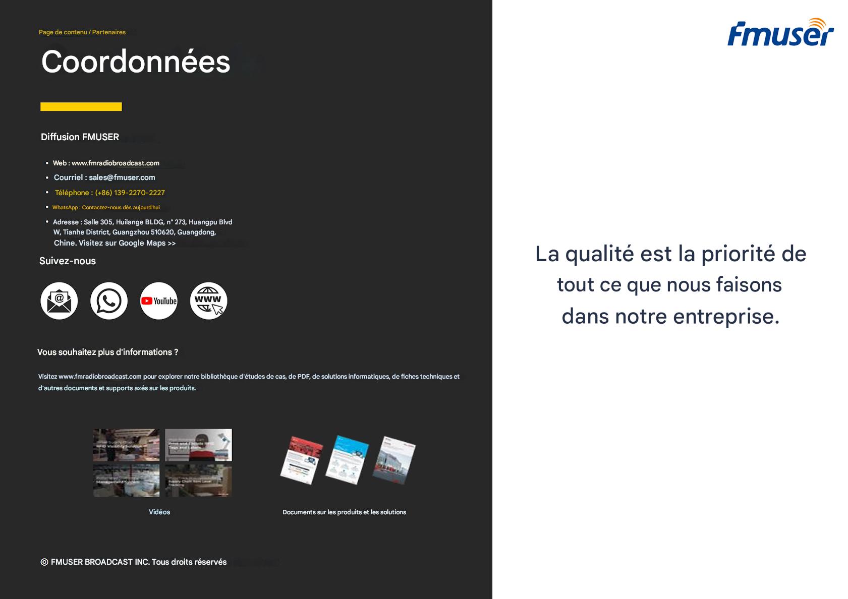 FMUSER INTERNATIONAL GROUP LIMITED est spécialisé dans les solutions audiovisuelles et télécoms de pointe pour les ingénieurs et intégrateurs de systèmes du monde entier. Basés à Guangzhou, nous fournissons des systèmes personnalisés et évolutifs pour les applications broadcast, professionnelles et industrielles. Notre expertise couvre le streaming en temps réel, la distribution de signaux et les infrastructures de communication critiques.
