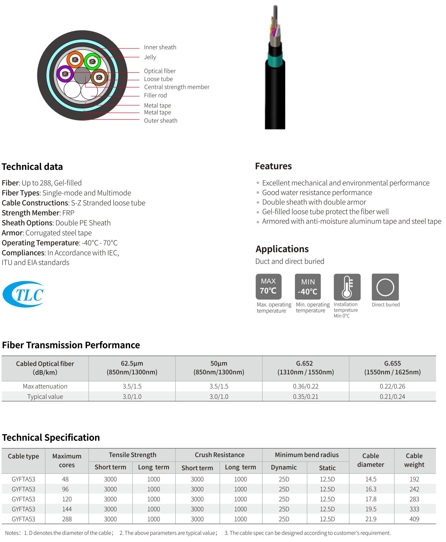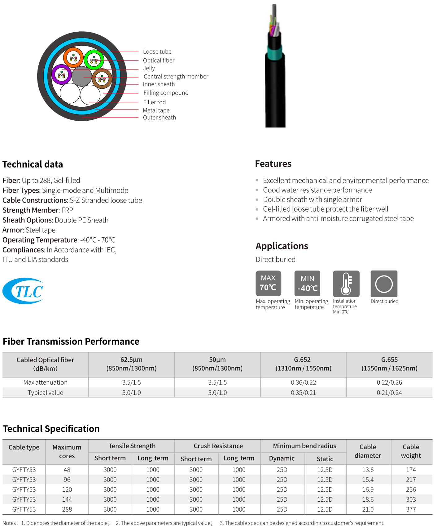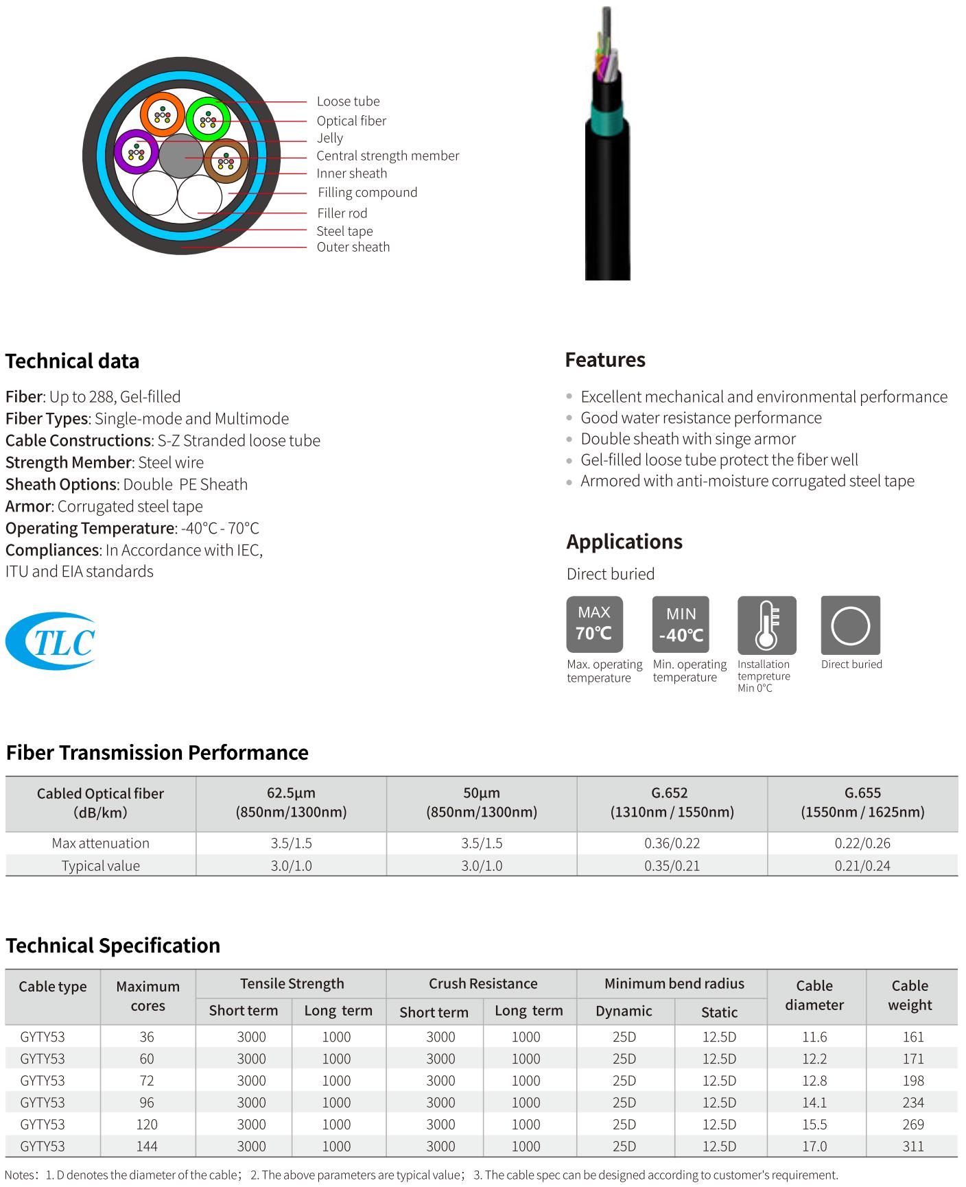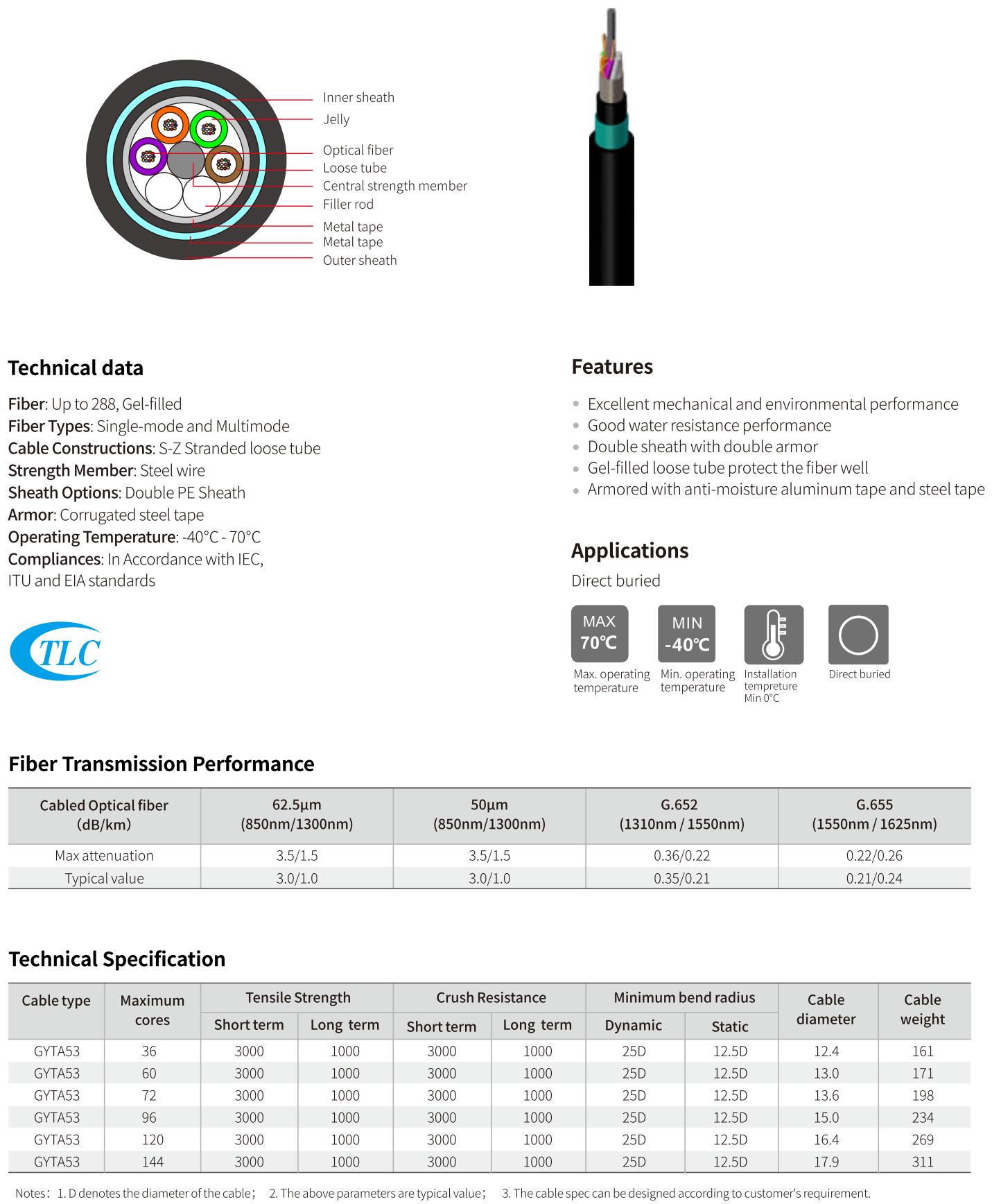 For direct burial applications, our GYTY53, GYTA53, GYFTY53, and GYFTA53 cables provide durable and reliable connections, with the ability to withstand challenging burial environments.