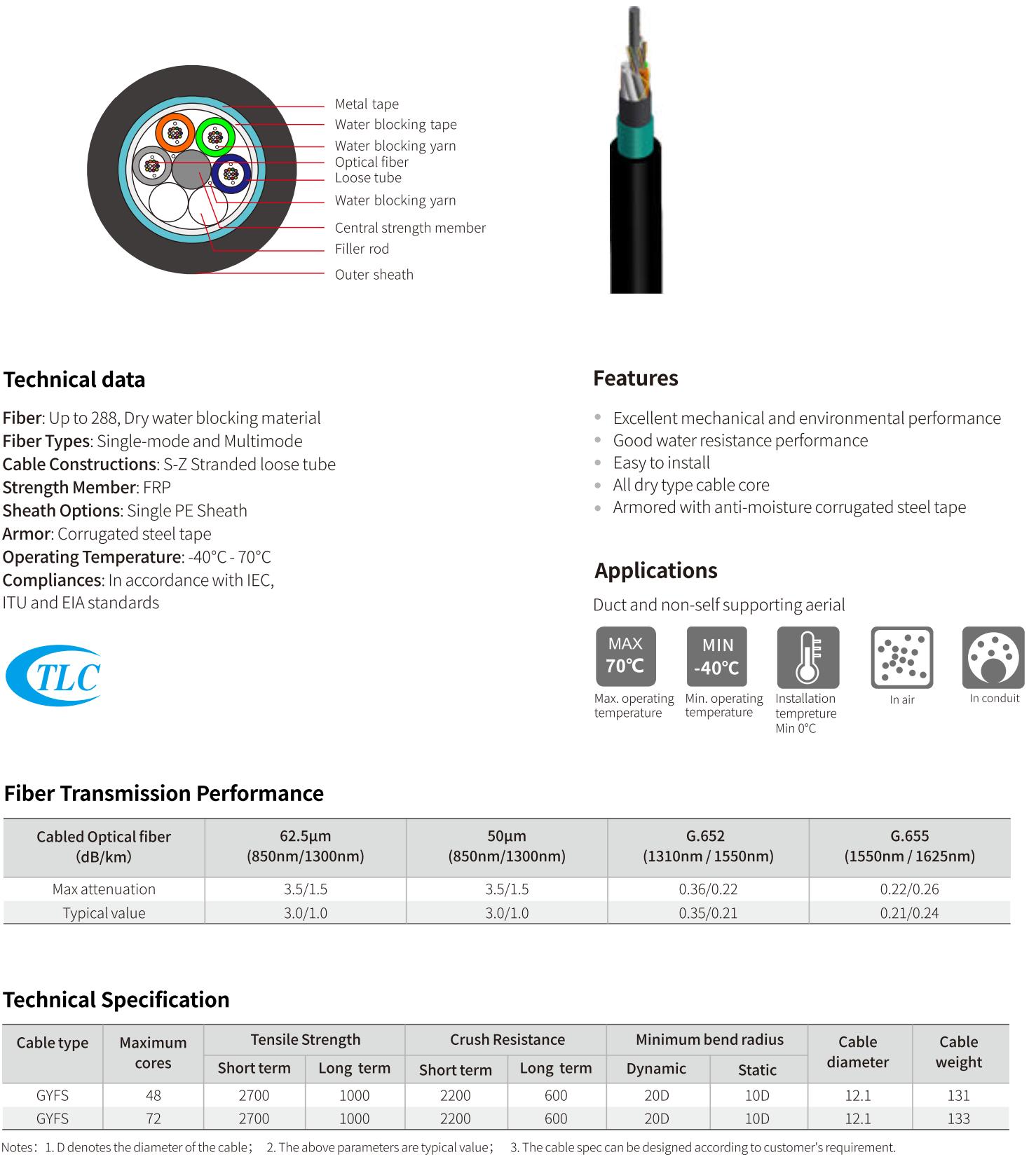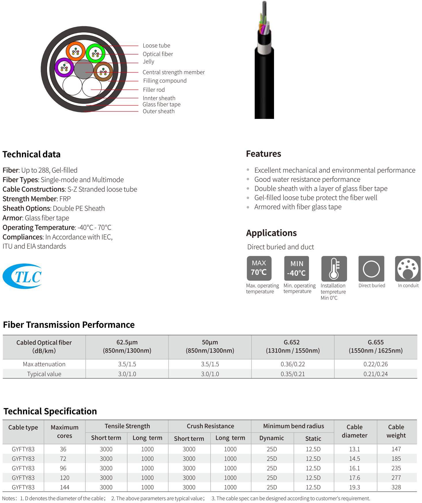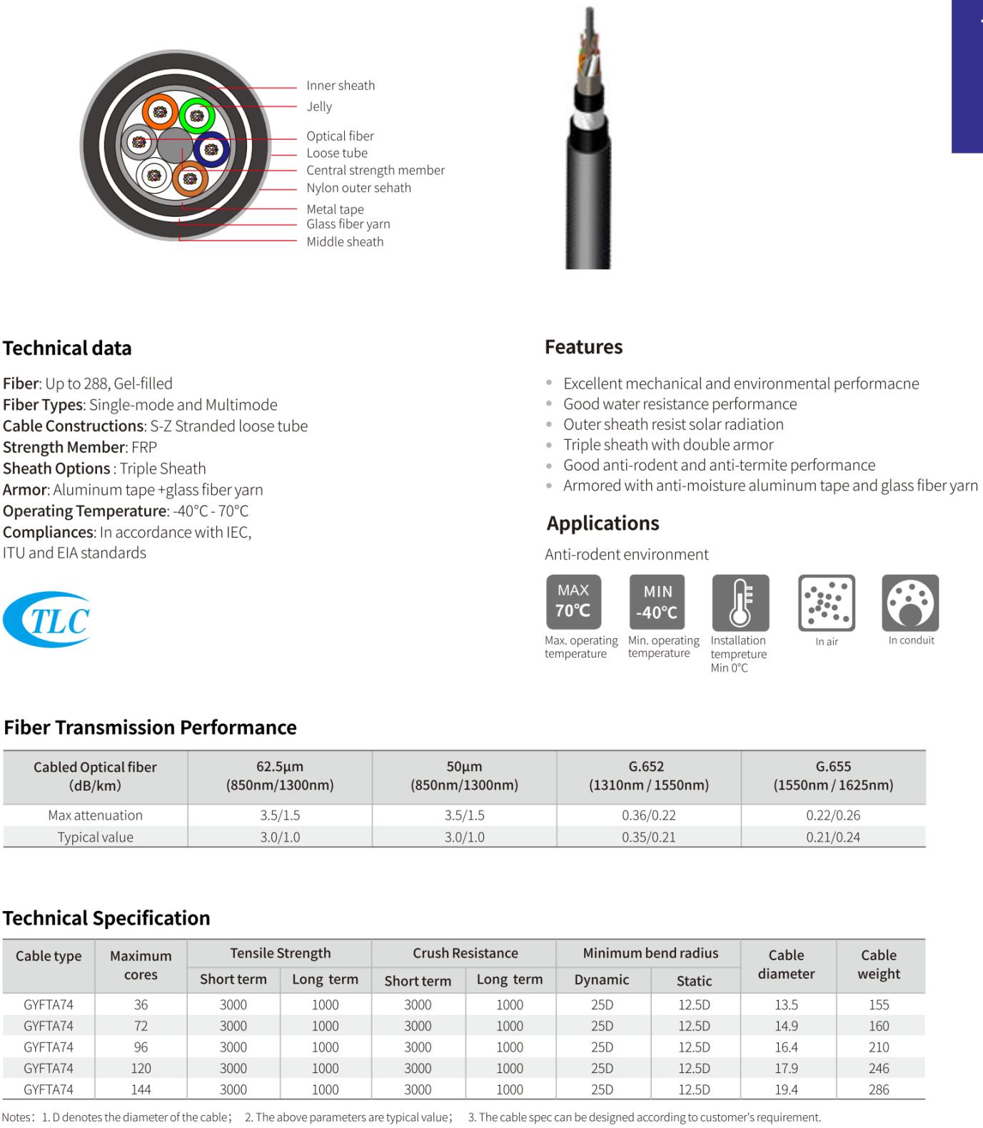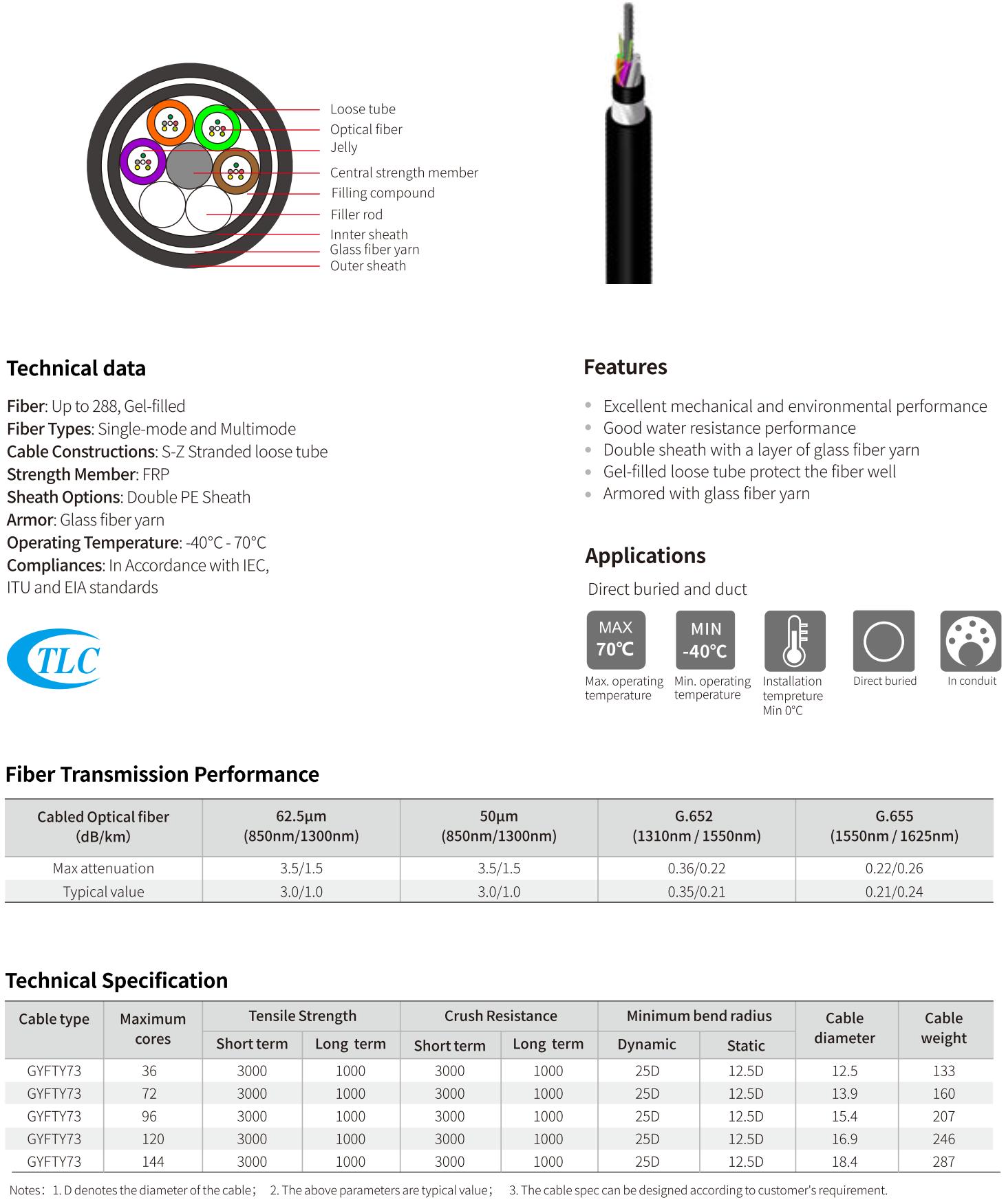 For direct burial applications, our GYTY53, GYTA53, GYFTY53, and GYFTA53 cables provide durable and reliable connections, with the ability to withstand challenging burial environments.