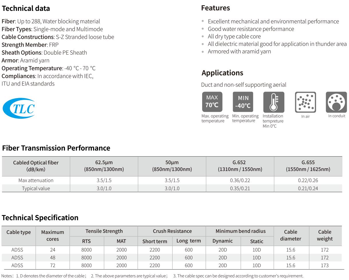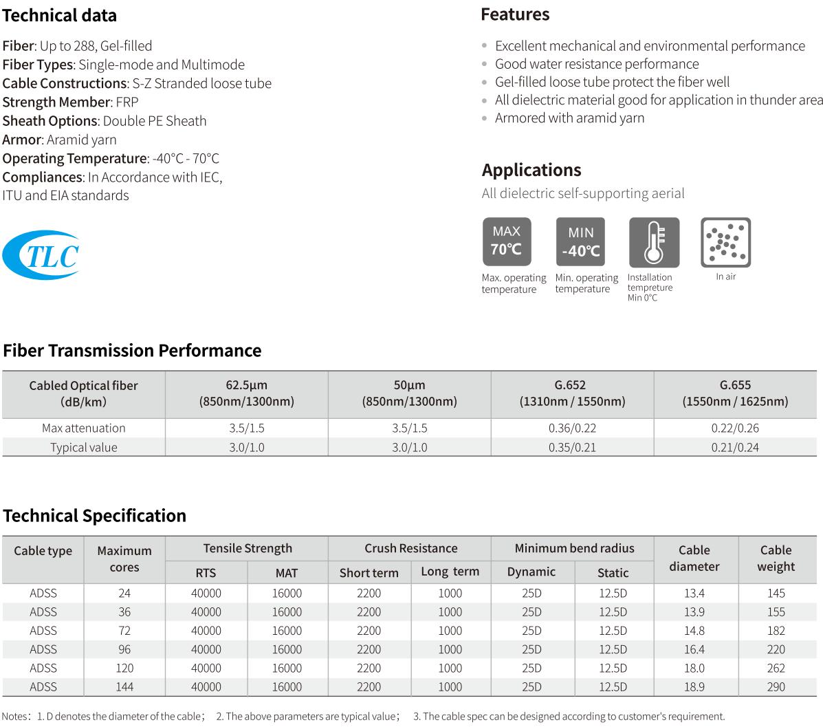 The ADSS (All Dielectric Self-Supporting) cable is specifically designed for aerial installations, offering excellent dielectric properties and selfsupporting capabilities. This cable ensures reliable transmission while withstanding environmental factors.