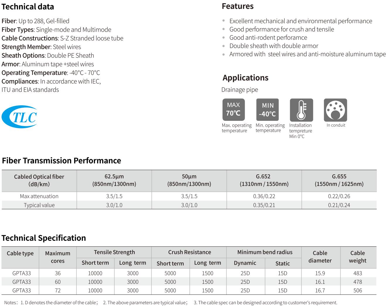 FMUSER's drainage pipe optic fiber cable GPTA33 is designed to be installed within drainage pipes, providing reliable fiber optic connectivity in challenging environments. This cable ensures efficient data transmission while withstanding the conditions within drainage systems.