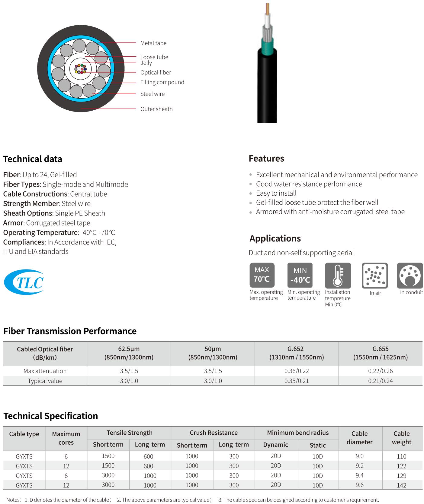 Our duct and non-self-supporting aerial cables, including GYTA, GYTS, GYFTY, GTFTA, GYFTW, GYXTW, GYXTS, are designed for installation in ducts or aerial applications, ensuring robust and dependable connectivity.