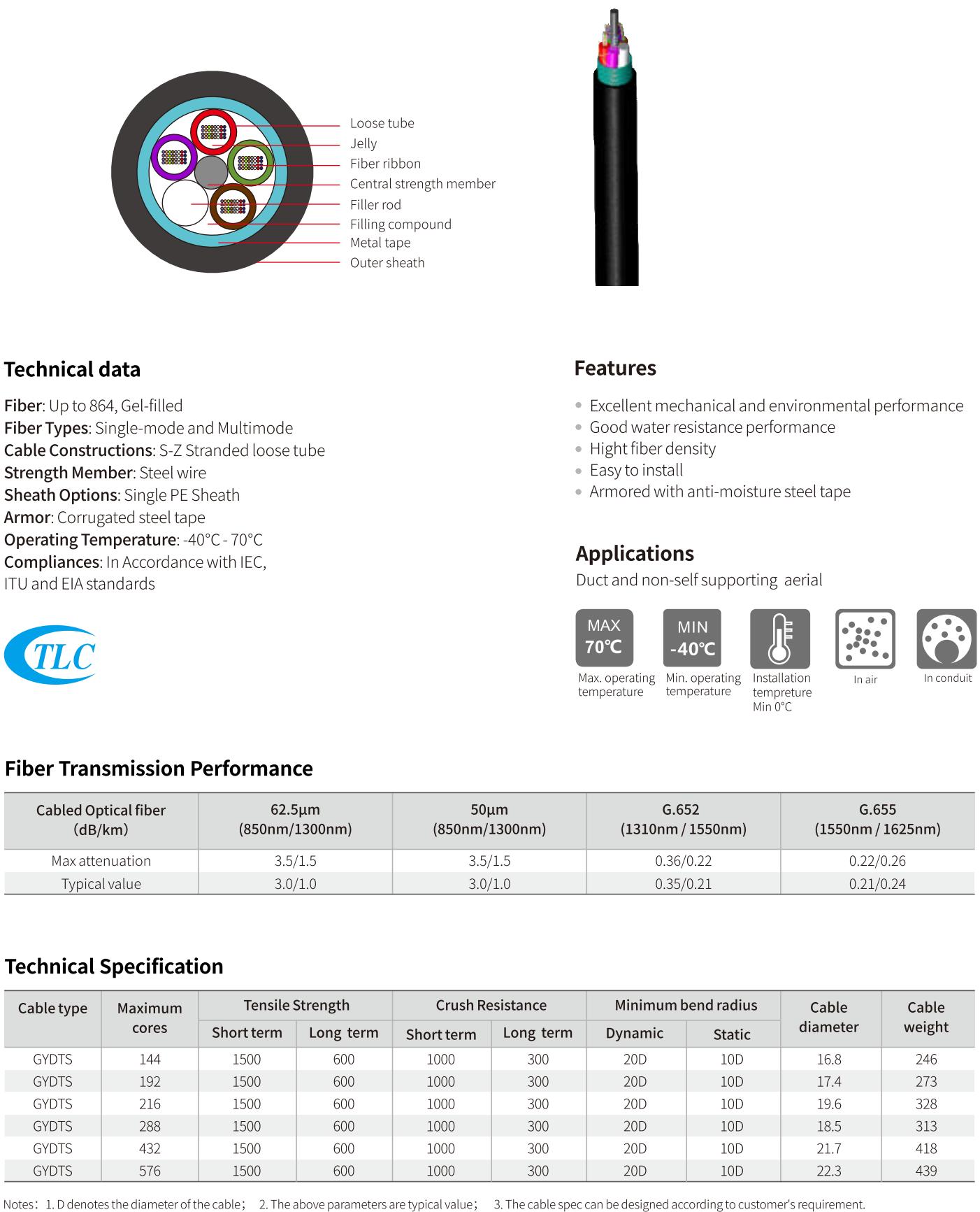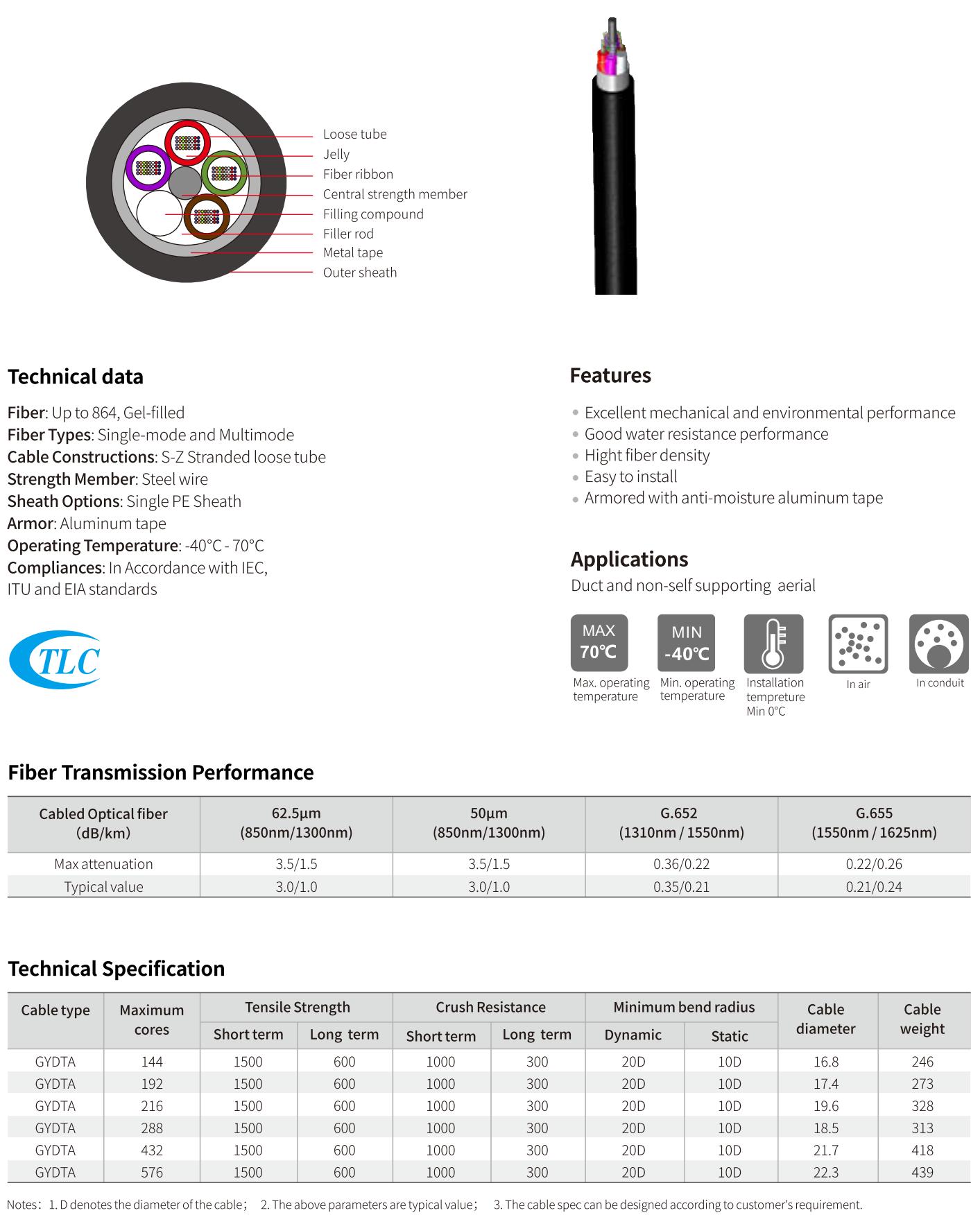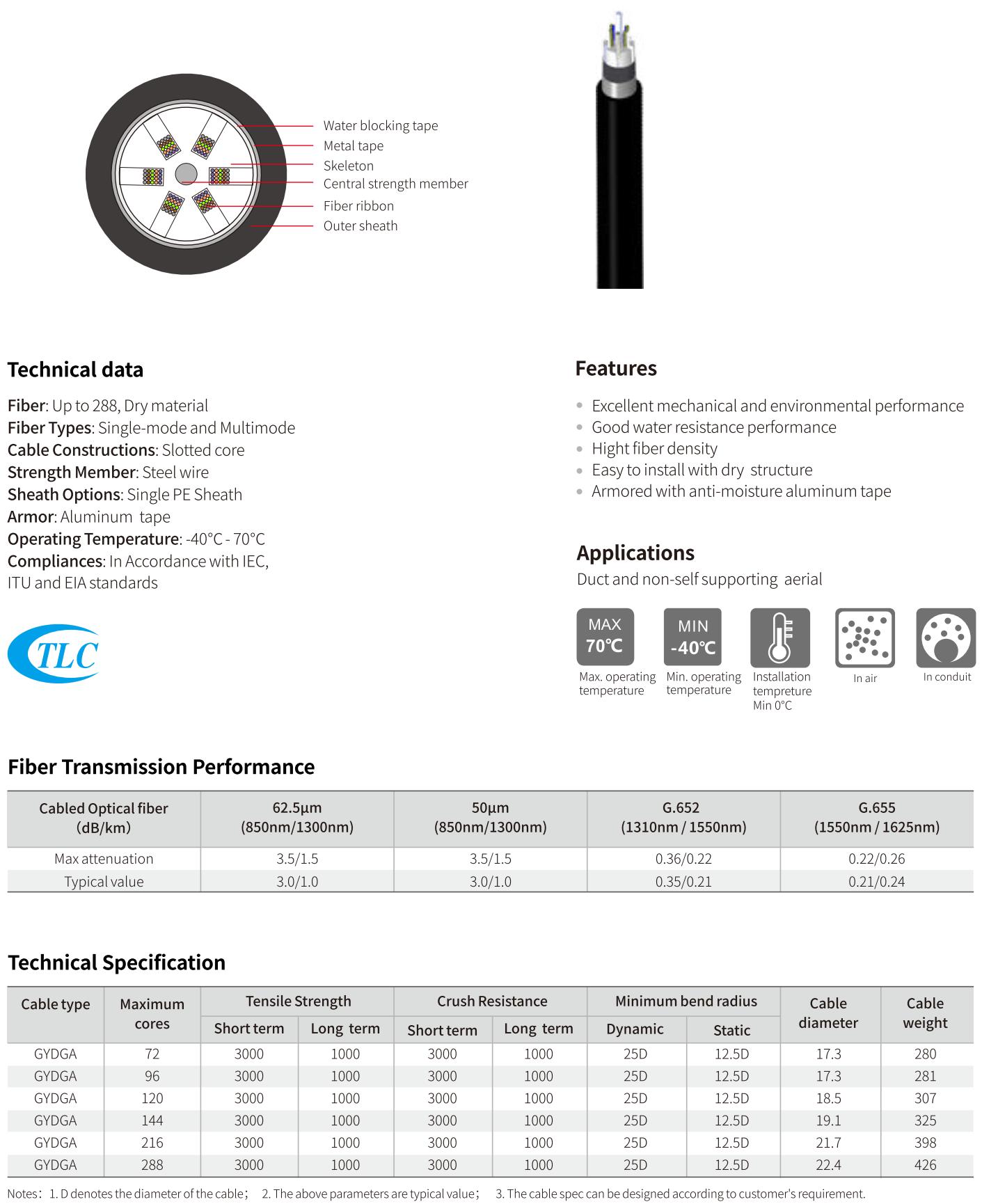 Our ribbon optic fiber cables, including GYDTA, GYDTS, GYDXTW, and GYDGA, provide high-density connectivity with enhanced performance, making them ideal for applications that require efficient management of multiple fibers.