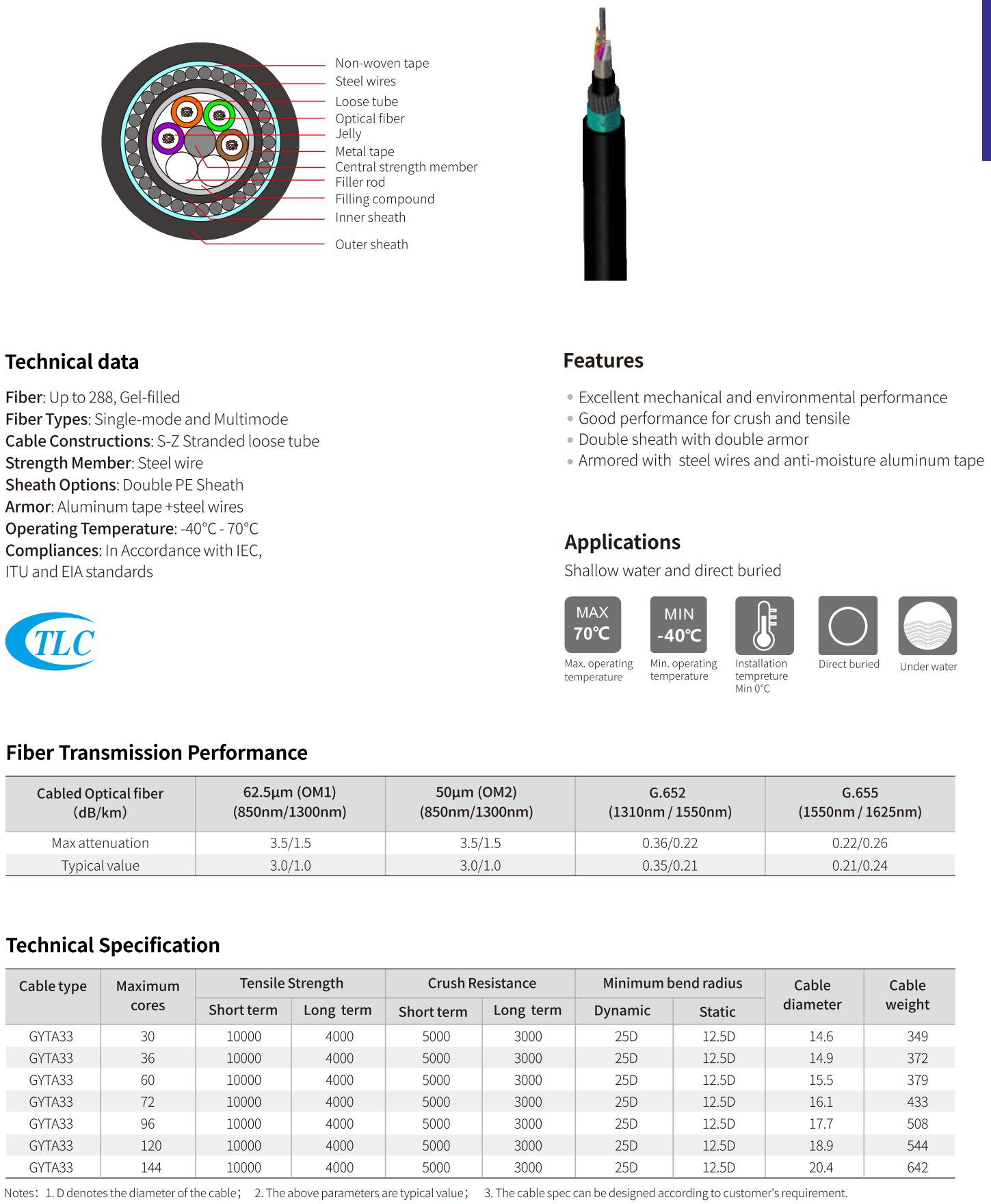 To address shallow water applications, we provide GYTA33 and GYTS333 cables, designed to withstand the challenges of underwater installations while maintaining excellent signal transmission.