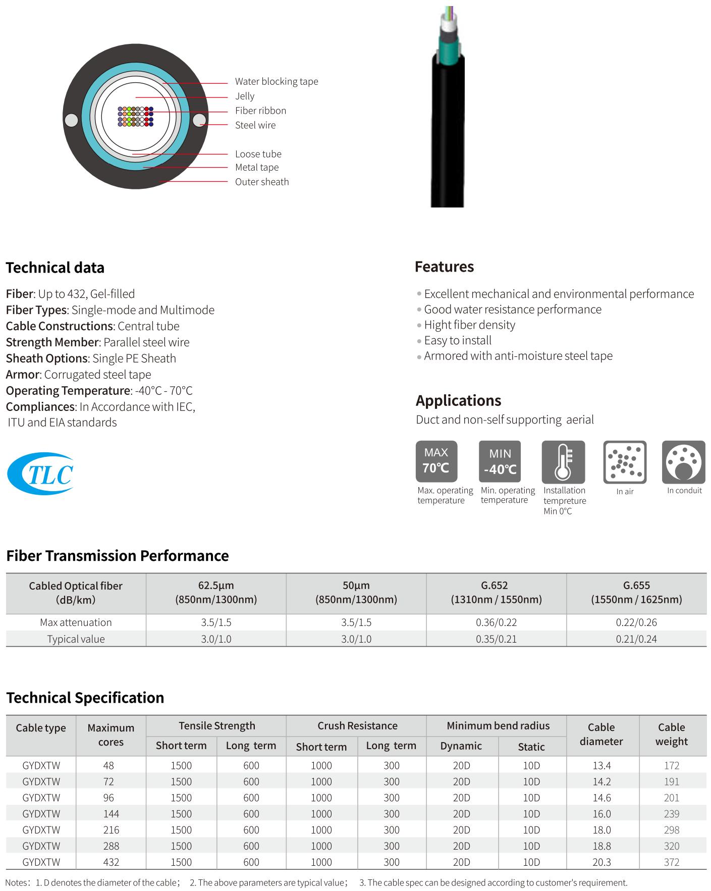 Our duct and non-self-supporting aerial cables, including GYTA, GYTS, GYFTY, GTFTA, GYFTW, GYXTW, GYXTS, are designed for installation in ducts or aerial applications, ensuring robust and dependable connectivity.