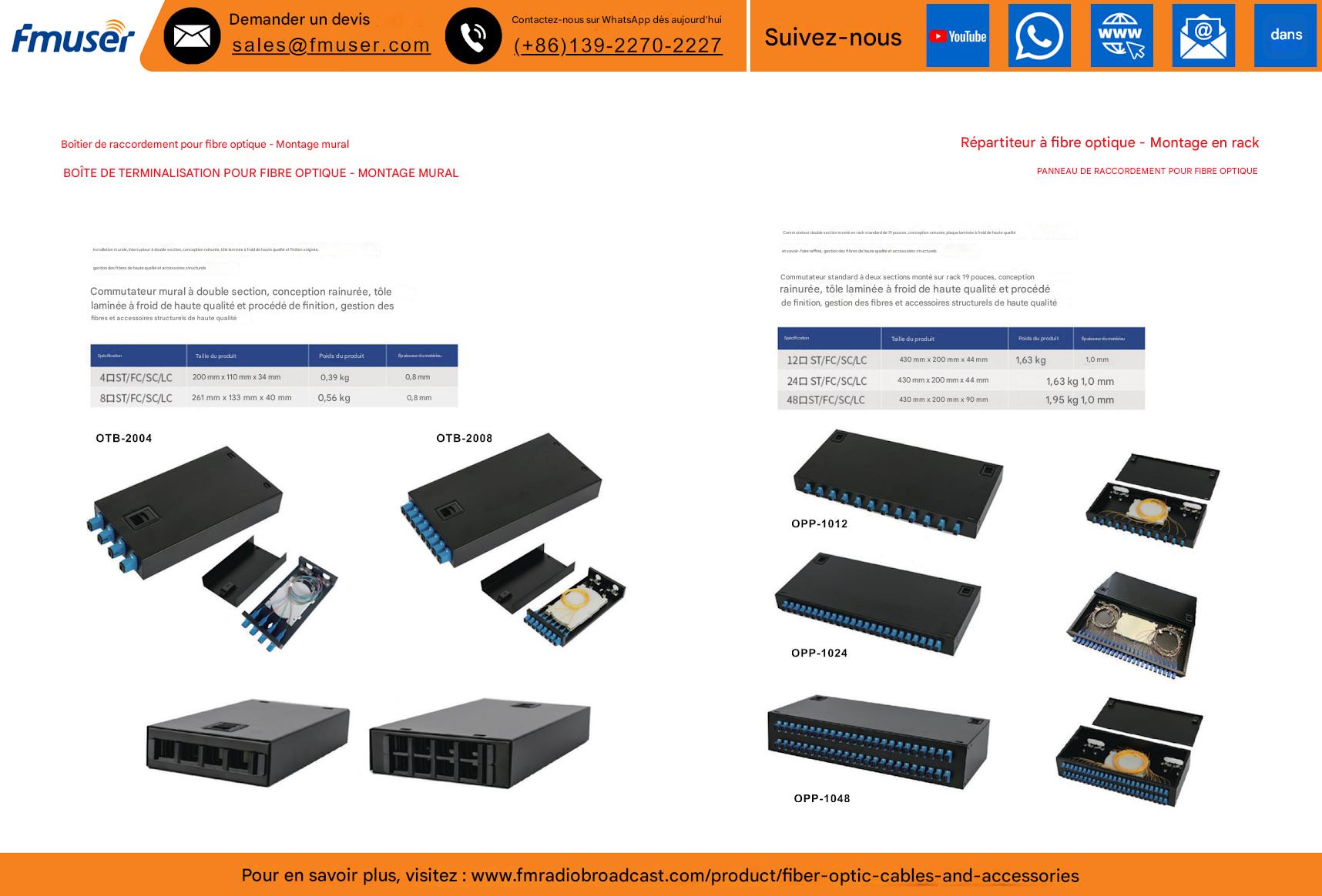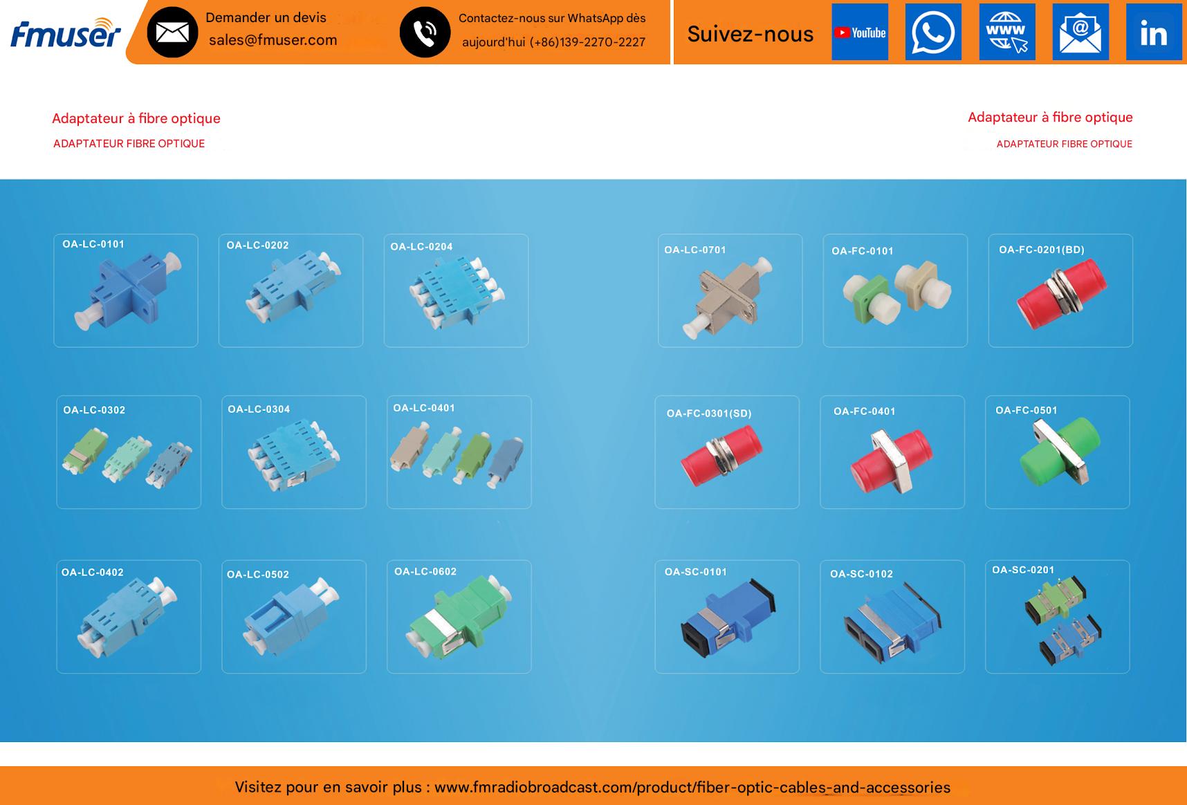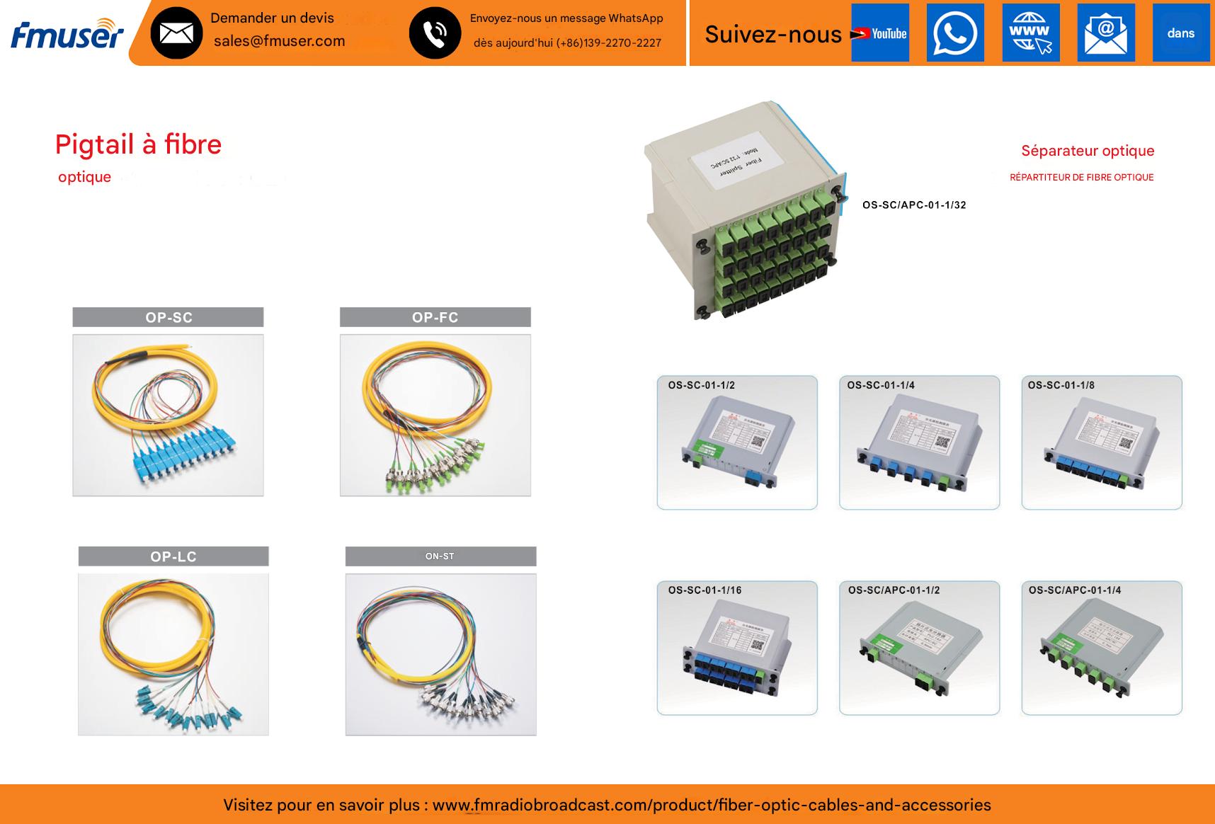 Découvrez les composants fibre optique professionnels de FMUSER, notamment les connecteurs, adaptateurs, répartiteurs et boîtiers pour les télécommunications, les centres de données et les déploiements FTTX. Ils proposent des options fibre SM/MM, des interfaces LC/SC et des conceptions robustes pour garantir une intégrité optimale du signal et une évolutivité du réseau.