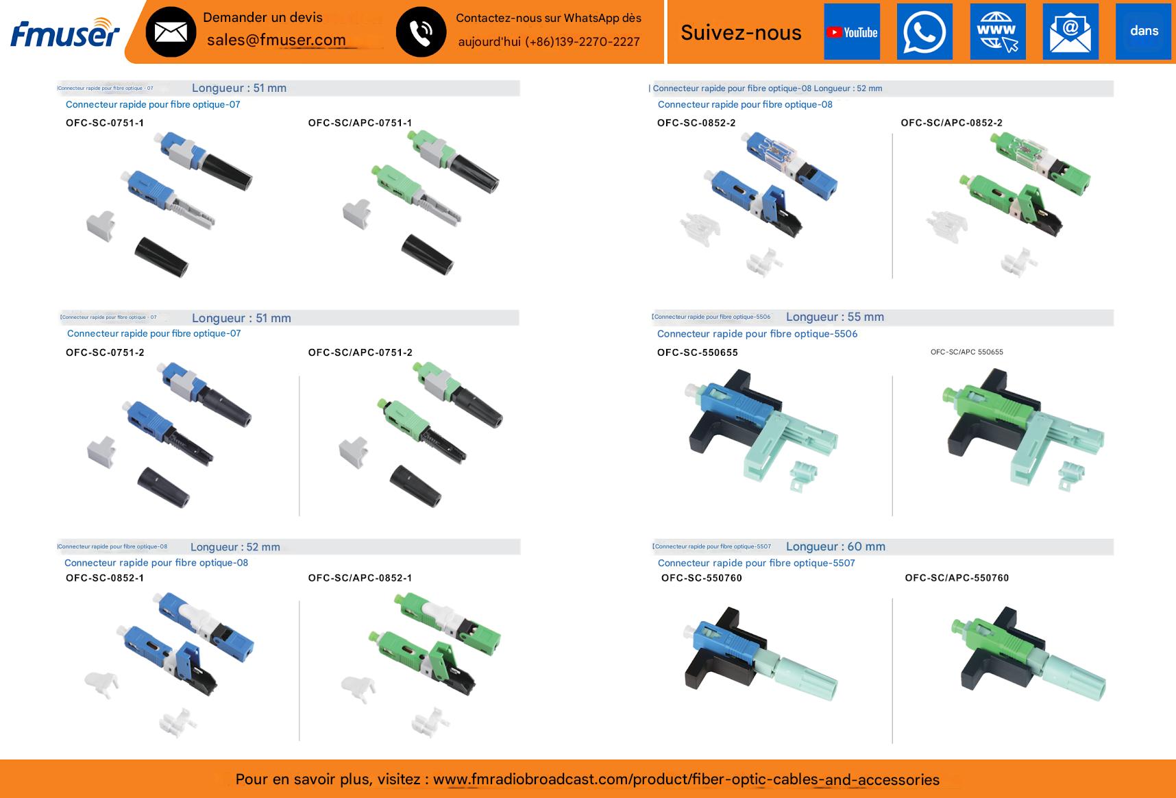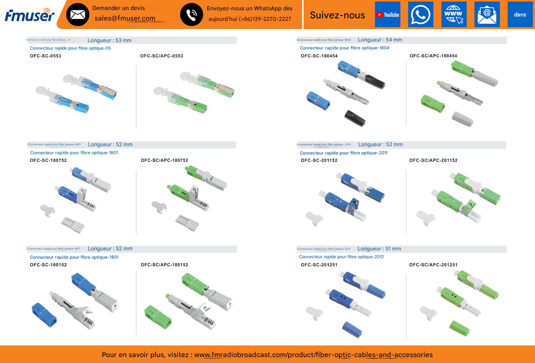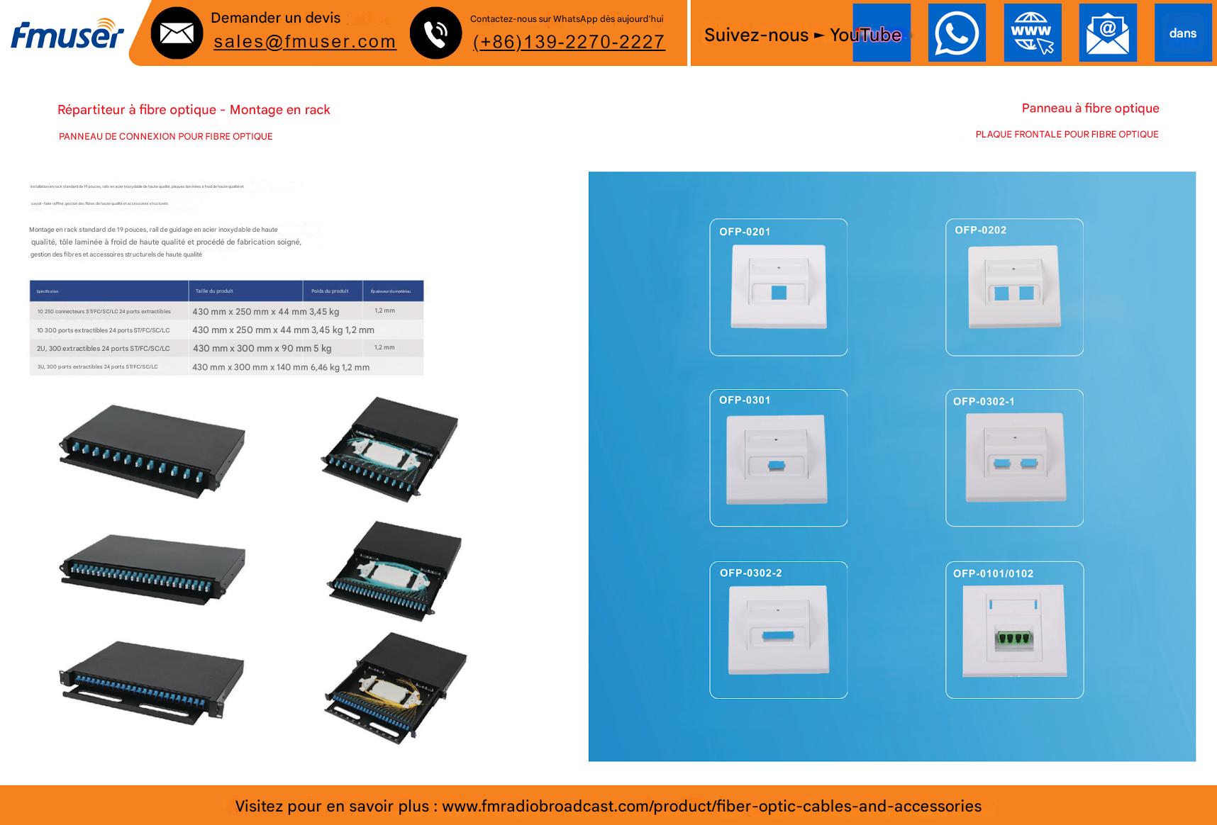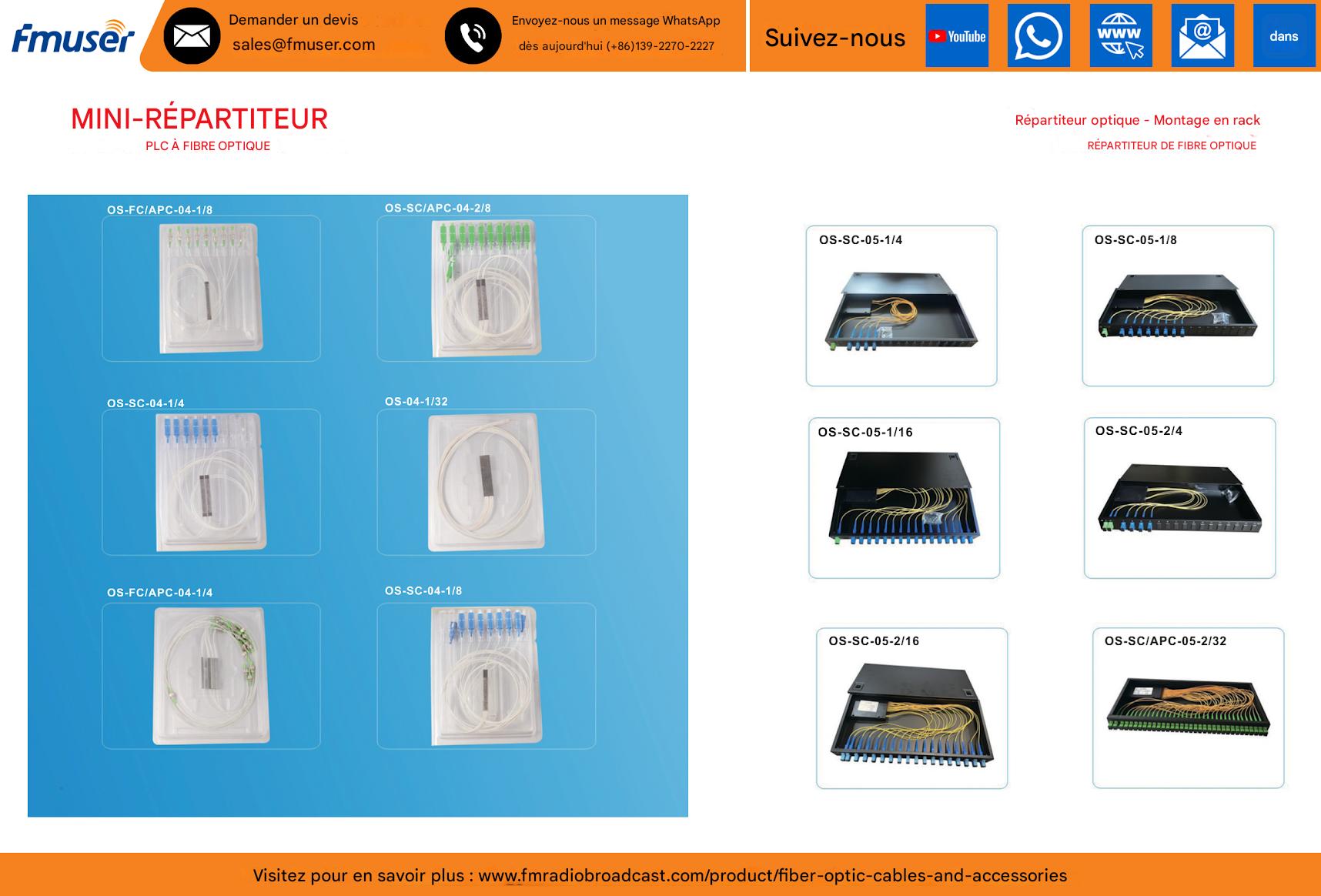 Découvrez les composants fibre optique professionnels de FMUSER, notamment les connecteurs, adaptateurs, répartiteurs et boîtiers pour les télécommunications, les centres de données et les déploiements FTTX. Ils proposent des options fibre SM/MM, des interfaces LC/SC et des conceptions robustes pour garantir une intégrité optimale du signal et une évolutivité du réseau.
