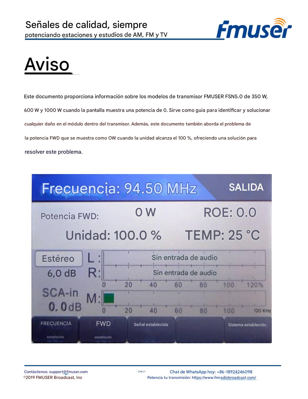 Solucione los problemas de FWD=0W y Drive=100% en los transmisores FMUSER de la serie FSN-5.0 (FSN-350T, FSN-600T, FSN-T) con esta guía técnica. Incluye diagnósticos paso a paso, protocolos de ajuste de potencia y opciones de soporte multicanal para integradores de sistemas. Contacte con support@fmuser.com o acceda a las soluciones indexadas para una rápida resolución de problemas.