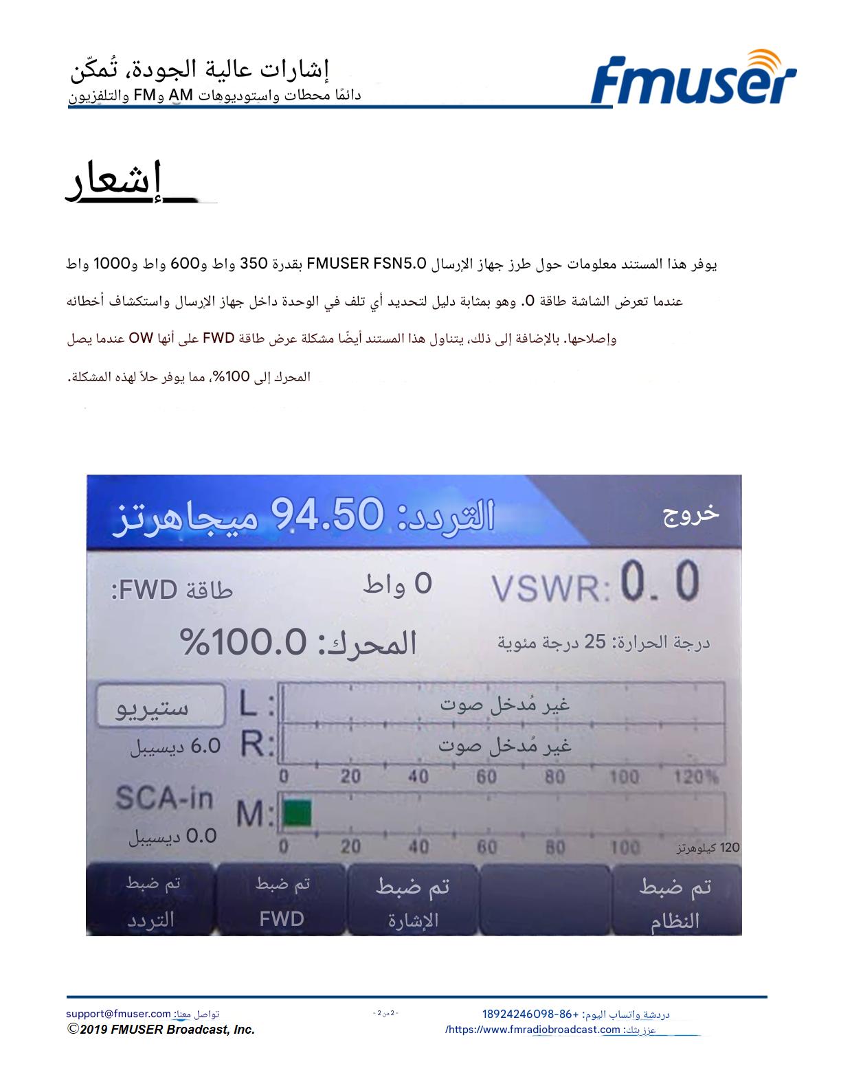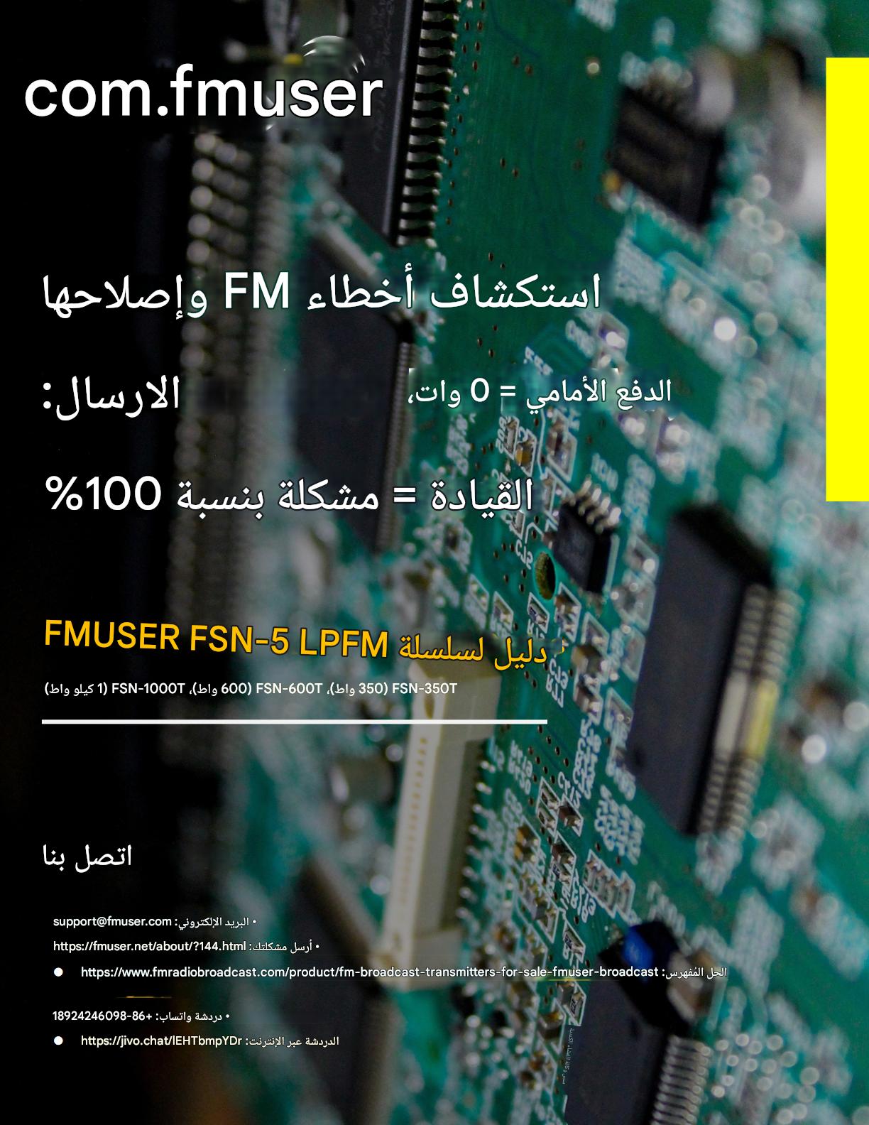 حلّ مشاكل FWD=0W وDrive=100% في أجهزة إرسال FMUSER FSN-5.0 (FSN-350T، FSN-600T، FSN-T) باستخدام هذا الدليل الفني. يتضمن هذا الدليل تشخيصًا تفصيليًا، وبروتوكولات ضبط الطاقة، وخيارات دعم متعددة القنوات لمُدمجي الأنظمة. تواصل معنا عبر البريد الإلكتروني support@fmuser.com أو اطّلع على الحلول المُفهرسة لاستكشاف الأخطاء وإصلاحها بسرعة.